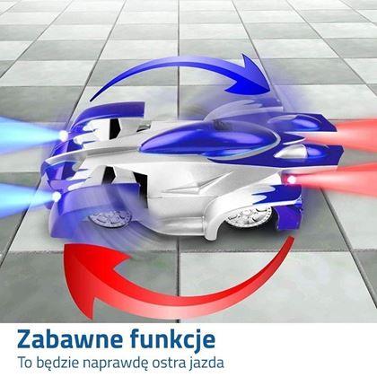 Ziemska grawitacja zostanie całkowicie pokonana dzięki wentylatorowi, który unosząc autko, pozwoli mu jeździć nawet po suficie. Niewskazane do użycia na dywanie. Ta jazda będzie naprawdę ekscytująca. Dla jeszcze większej atrakcyjności ma wbudowane diodowe oświetlenie i jest sterowane zdalnie.