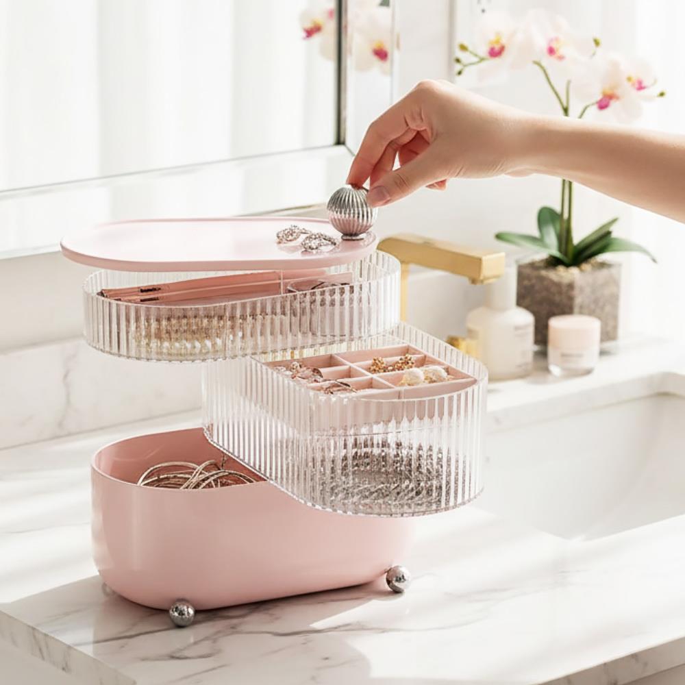 Każda miłośniczka biżuterii wie, że nigdy nie można mieć jej wystarczająco. Z tym jednak wiąże się jeden mały problem – gdzie ją wszystkie przechowywać, aby panował w nich nie tylko porządek, ale przede wszystkim, aby się nie uszkodziły? Dla wszystkich, które swoim kosztownościom chcą zapewnić miejsce, w którym będą chronione przed wpływami zewnętrznymi, a jednocześnie będą pod ręką, mamy to przepiękne puzderko na biżuterię. Eleganckie i przejrzyste, piękne i wspaniałe dzięki obrotowym przegródką, takie jest to trójwarstwowe puzderko, które bezpiecznie przechowa wasze łańcuszki, bransoletki, kolczyki, pierścionki, a nawet zegarki i broszki. Będzie się wyróżniać na każdym stole kosmetycznym i doda mu nutę luksusu. Jego klasyczny wygląd docenią także ci, którzy lubią minimalizm, ponieważ łączy subtelny stary różowy kolor ze srebrnymi detalami i przezroczystymi rowkowanymi przegródkami.
