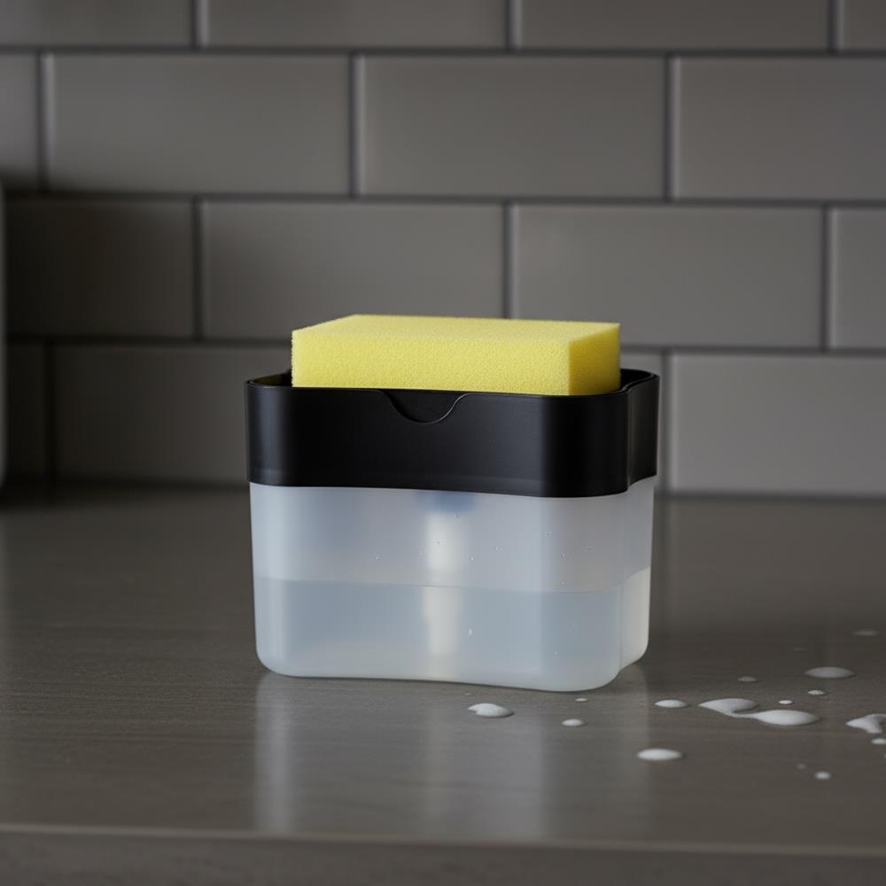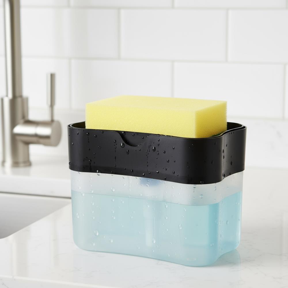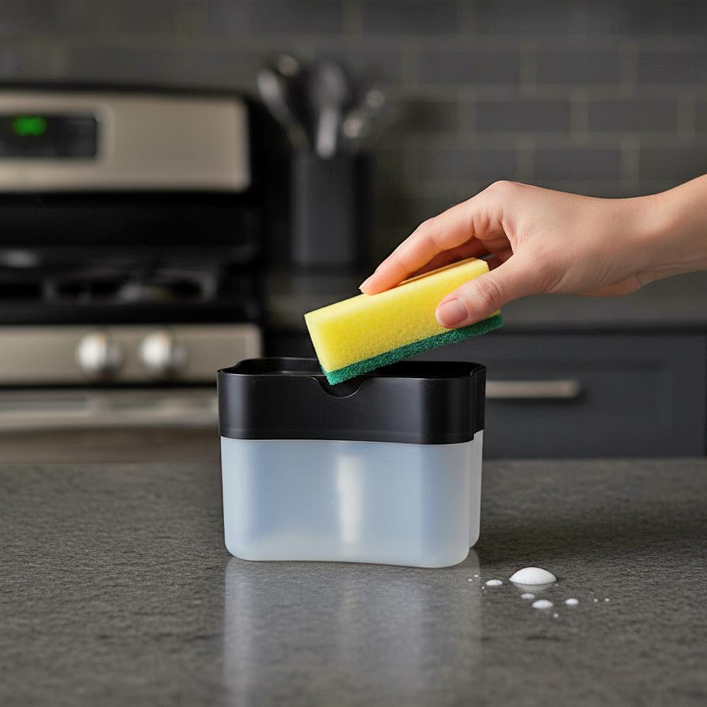 Z dozownikiem płynu do mycia naczyń zmywanie jeszcze nigdy nie było tak proste. Jest inteligentnie zaprojektowany, dzięki czemu płyn nie rozleje się wokół zlewu, ale zostanie dozowany w idealnej ilości bezpośrednio na gąbkę. Wystarczy wlać swój ulubiony płyn do dozownika. Następnie kilka razy naciśnij górną część dozownika gąbką. Organizer na gąbkę i płyn uporządkuje przestrzeń wokół twojego zlewu.