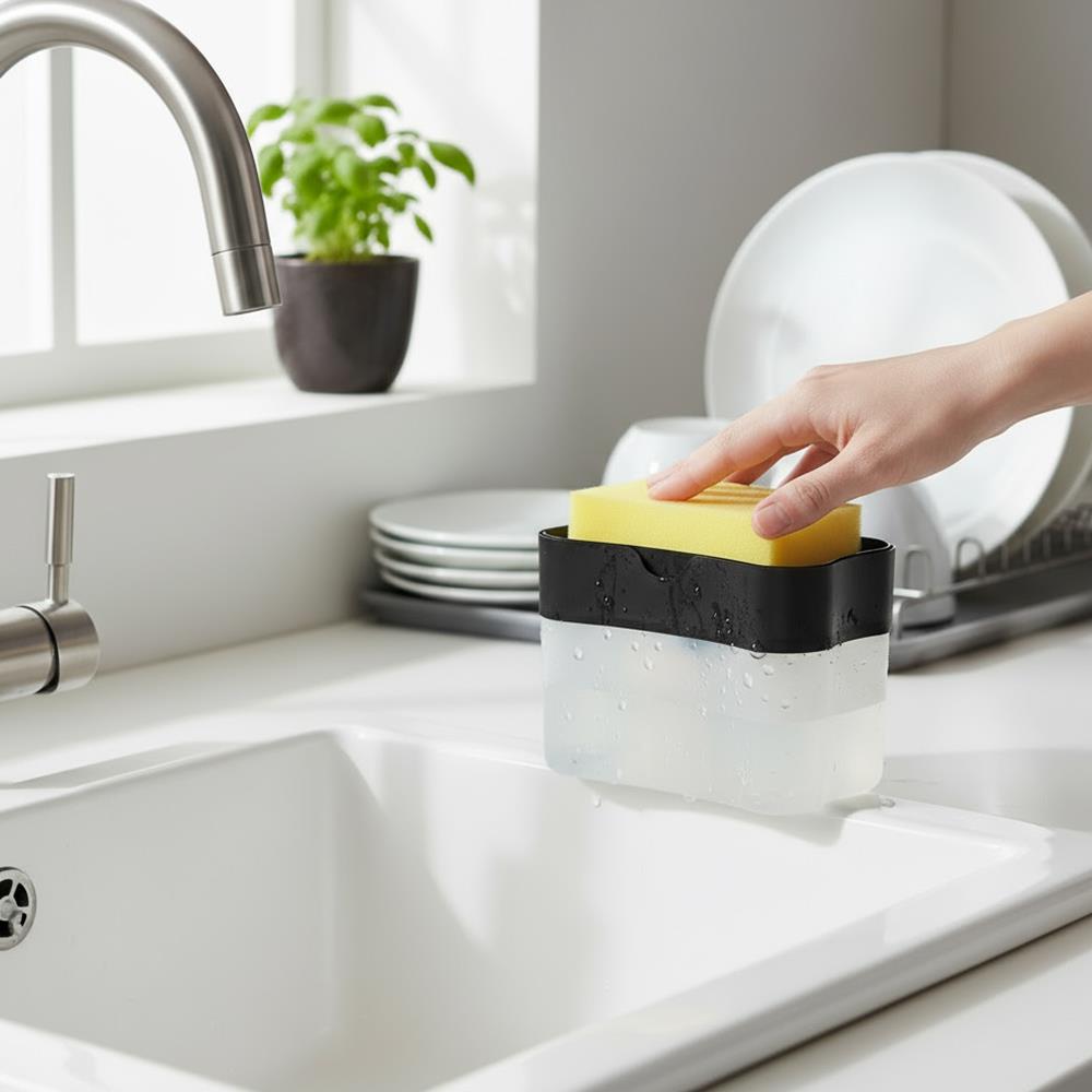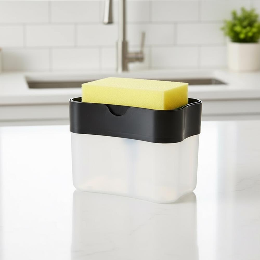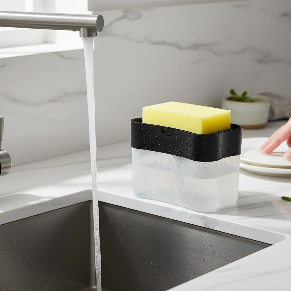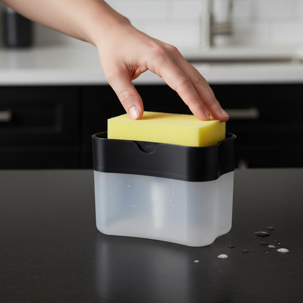 Z dozownikiem płynu do mycia naczyń zmywanie jeszcze nigdy nie było tak proste. Jest inteligentnie zaprojektowany, dzięki czemu płyn nie rozleje się wokół zlewu, ale zostanie dozowany w idealnej ilości bezpośrednio na gąbkę. Wystarczy wlać swój ulubiony płyn do dozownika. Następnie kilka razy naciśnij górną część dozownika gąbką. Organizer na gąbkę i płyn uporządkuje przestrzeń wokół twojego zlewu.