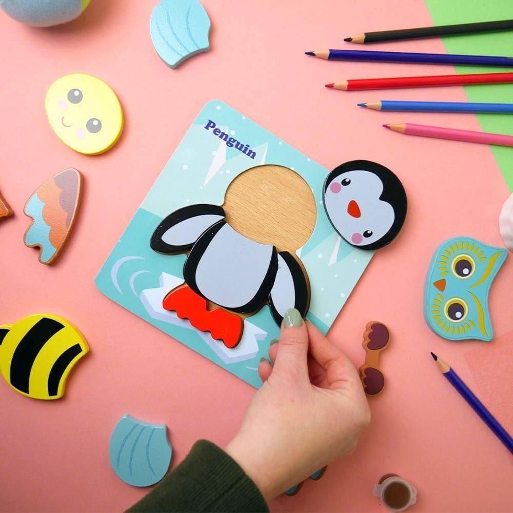 Drewniane puzzle będą świetną zabawą dla dzieci. Jest to jeden ze sposobów treningu zdolności dzieci, motoryki małej, manipulacji przedmiotami czy koncentracji na danej czynności. Po jej wypełnieniu można porozmawiać z dziećmi na temat danego zwierzęcia, czyli pszczoły, wspólnie ją opisać lub wymyślić różne historie i narracje dotyczące jej roli w przyrodzie. Puzzle składają się z kilku dużych elementów, które są wkładane do drewnianej tabliczki. Części są wystarczająco duże, aby małe dzieci mogły je dobrze chwycić.