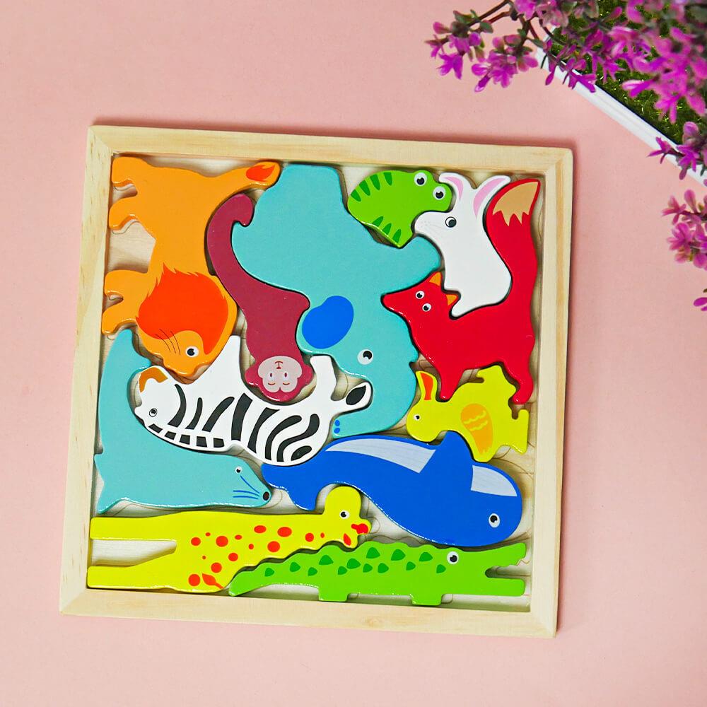 Nauka i zabawa w jednym – to drewniane puzzle ze zwierzątkami, które można wyjąć z drewnianego pudełka i pozwolić swoim pociechom spróbować ułożyć je z powrotem w kształt kwadratu lub bawić się każdym elementem osobno. Drewniane puzzle wspierają logiczne myślenie i wyobraźnię Twoich dzieci. Poszczególne elementy są pięknie kolorowe, dzięki czemu przyciągają uwagę najmłodszych.