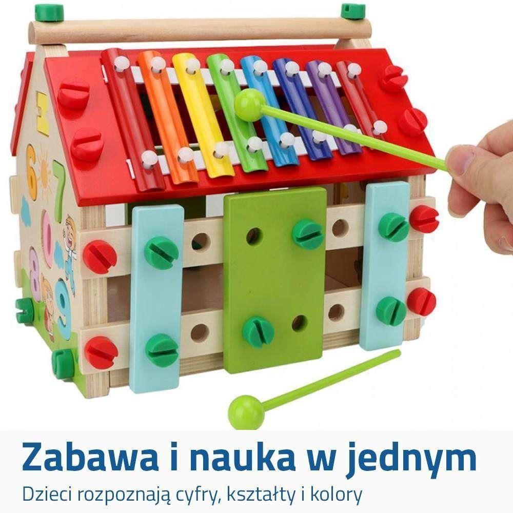 Domek jest odpowiednią zabawką, która bawi i jednocześnie uczy. Dzięki temu, że dzieci same go składają, rozwijają swoją zręczność i motorykę. Otwory na bokach uczą dzieci rozpoznawania kształtów i cyfr. Kulki uczą kolorów, a ksylofon stymuluje słuch muzyczny.
