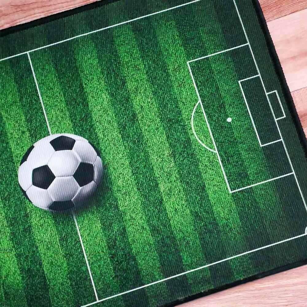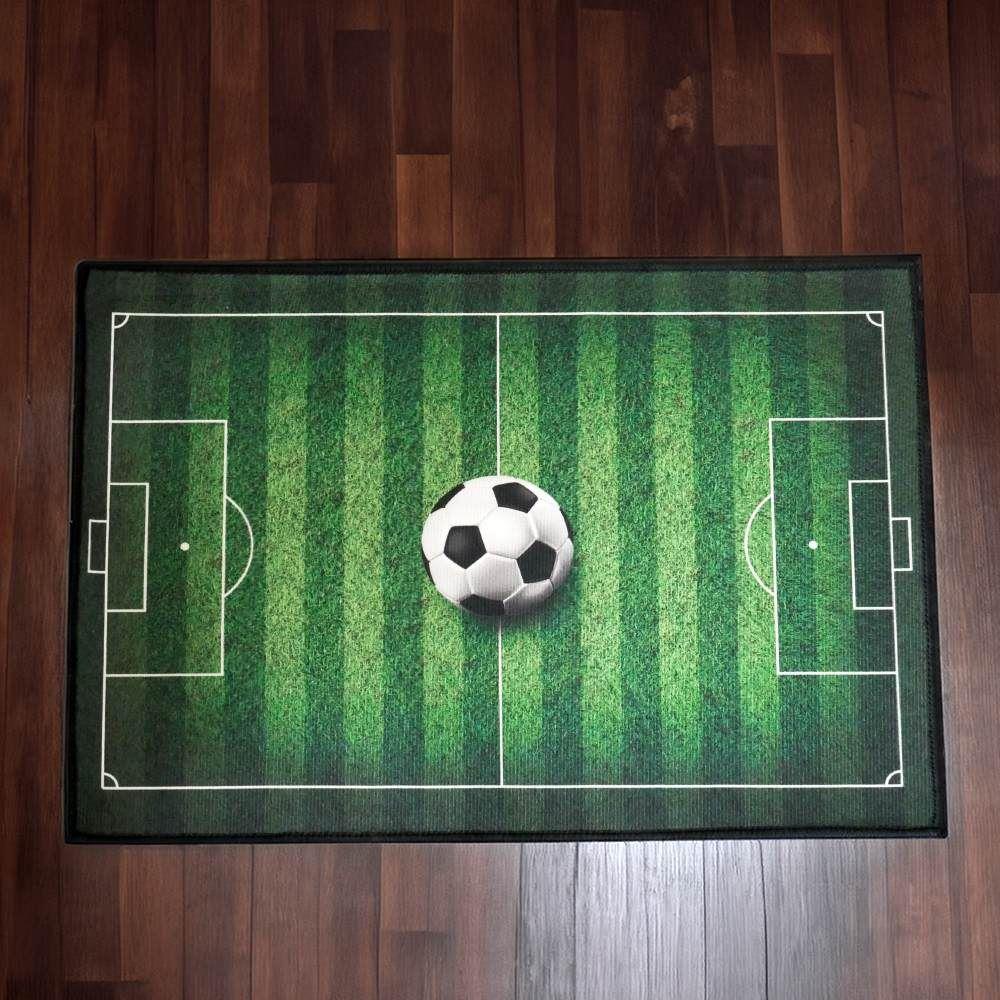 Dzięki temu dywanikowi z motywem boiska piłkarskiego z pewnością zadbasz o niespodziankę! Doskonale sprawdzi się zarówno w pokoju dziecięcym, gdzie mały sportowiec na pewno się nim pobawi, jak i w gabinecie lub męskim klubie, gdzie mecze piłkarskie traktuje się poważnie.