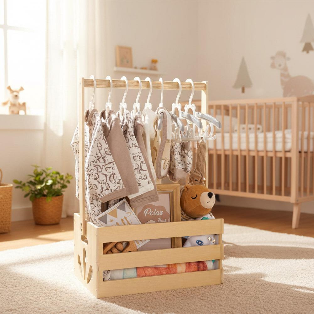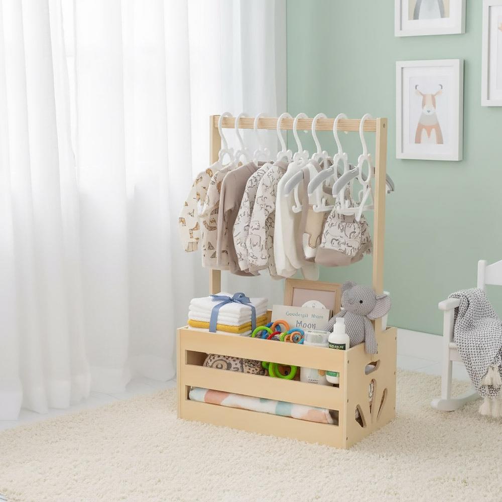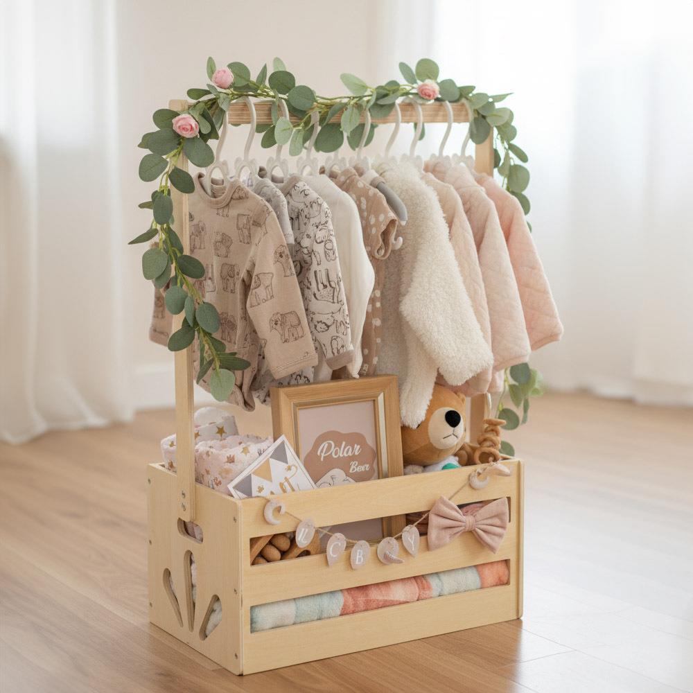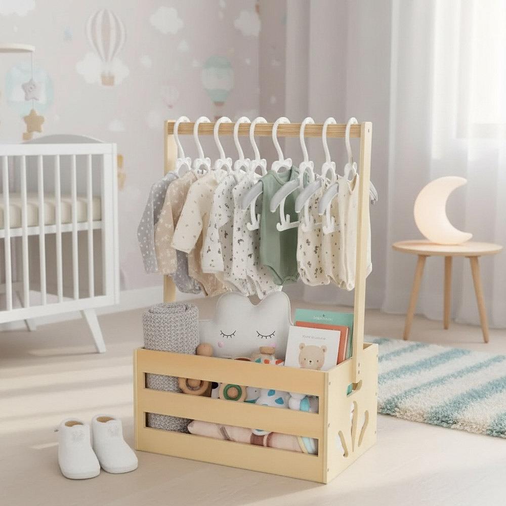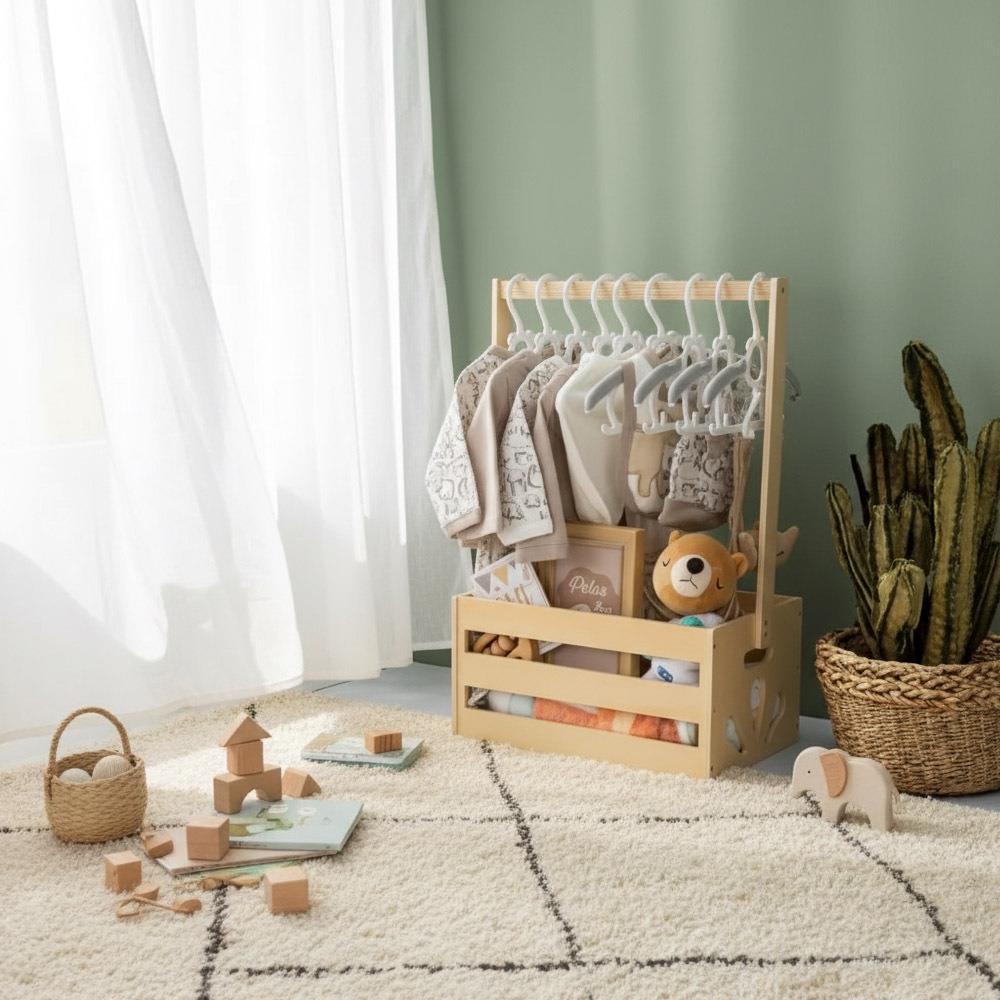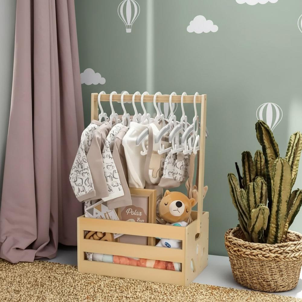 Czarodziejski koszyczku, co w sobie kryjesz? Oczywiście niezbędne rzeczy dla najbardziej magicznego stworzenia, które wkrótce pojawi się na świecie! Czekacie Wy lub Wasi bliscy na dziecko i zastanawiacie się, co kupić, żeby prezent nie tylko sprawił radość, ale także był praktyczny i przydatny na dłużej? W takim razie zerknijcie na ten piękny kosz, który posłuży jako stojak na ubranka. Najpierw wypełnijcie go wyprawką, a resztę zostawcie przyszłym rodzicom – wykorzystają go na przechowywanie codziennych rzeczy, od ubranek po zabawki, a także mogą w nim gromadzić wspomnienia z pierwszych lat swojego maluszka. Może stać się również częścią dziecięcego pokoiku, gdzie z jednego prezentu powstanie nie tylko praktyczna przestrzeń do przechowywania, ale też małe miejsce, w którym dziecko kiedyś schowa swoje skarby.