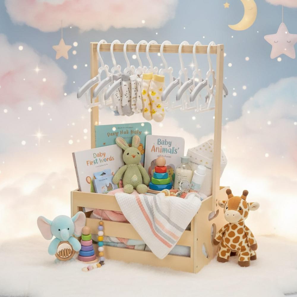 Kosz prezentowy ze stojakiem na narodziny dziecka