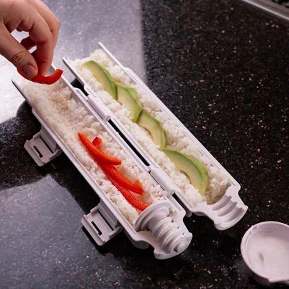 Manipulację z tym narzędziem opanujesz szybko - twoim jedynym zadaniem jest napełnienie formy ryżem i przygotowanymi składnikami, które pokrój na dłuższe paski. Możesz wybrać na przykład łososia, tuńczyka, ogórek lub awokado. Zamknij formę z nadzieniem i pomocą tłoka wciśnij nadzienie na przygotowaną wodorost. Potem wystarczy tylko zawinąć, pokroić powstałą rolkę i gotowe! Sushi polecamy podawać z sosem sojowym.