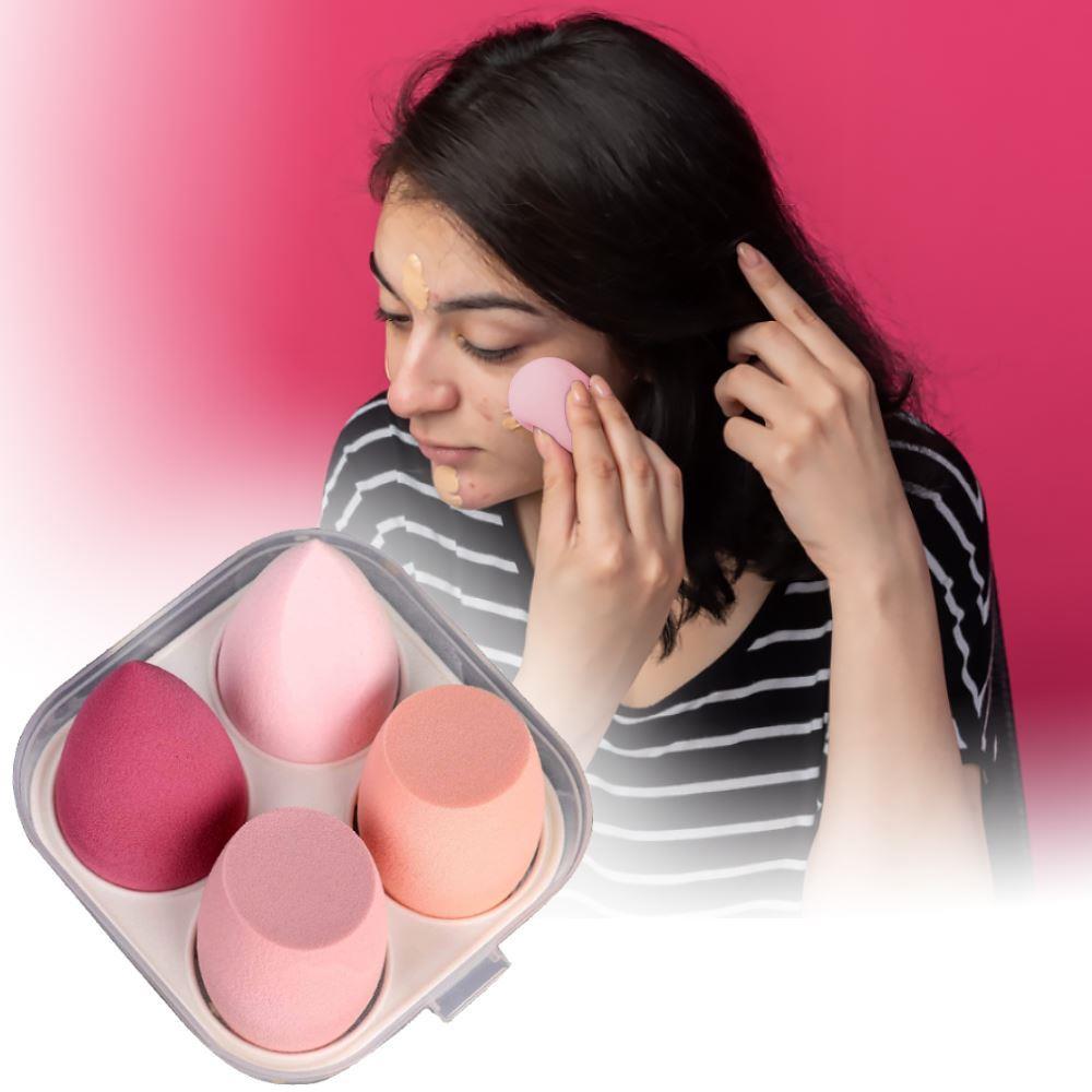 Gąbeczki do makijażu to niezbędna część wyposażenia kosmetyczki. Zapewniają perfekcyjną aplikację podkładu lub pudru. 4 gąbki są zapakowane w plastikowe pudełko. Mają 4 różne kształty i można je używać zarówno na mokro (do podkładu), jak i na sucho (do pudru). Po namoczeniu wodą zwiększają swoją objętość.