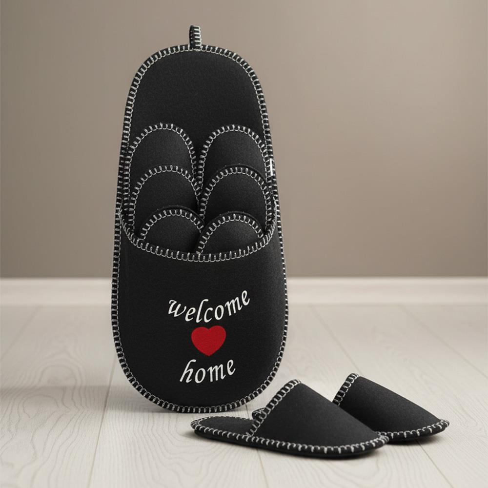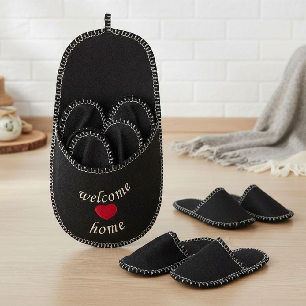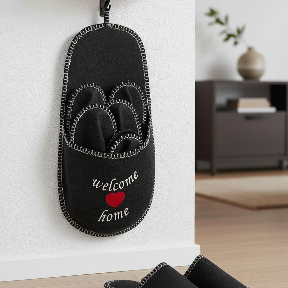 Ułóż kapcie dla gości w prosty sposób i bez zbędnego chaosu. Ten zestaw zawiera 5 par kapci w różnych rozmiarach, które są praktycznie uporządkowane w jednej dużej kapci. Wystarczy ją powiesić, a obuwie zawsze będzie pod ręką, co oszczędza miejsce i zapewnia przejrzystość przestrzeni. Kapcie pasują do każdego wnętrza, niezależnie od tego, czy umieścisz je w przedpokoju, czy w biurze. Napis „Welcome Home” z przodu doda Twojemu wnętrzu przyjemnego i ciepłego akcentu, który ucieszy każdego gościa.
