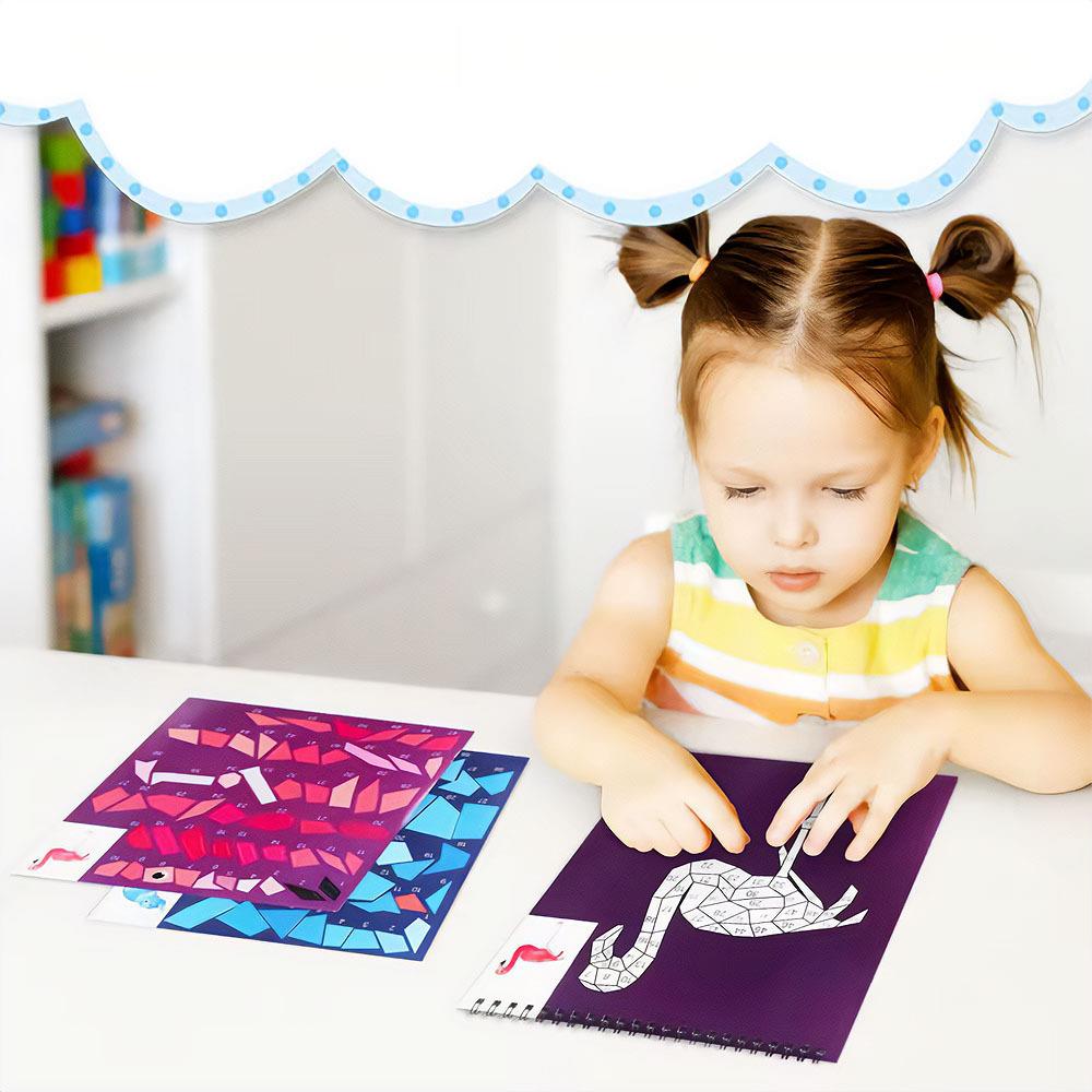 Kreatywny zestaw do wyklejania według numerów to świetna aktywność dla dzieci, które lubią tworzyć. Zeszyt zawiera 7 pięknych obrazków, do których dzieci stopniowo doklejają samoprzylepne elementy zgodnie z numeracją. Każdy kształt ma swój numer i dziecko łatwo znajdzie właściwe miejsce – rezultatem jest ładny mozaikowy obrazek.