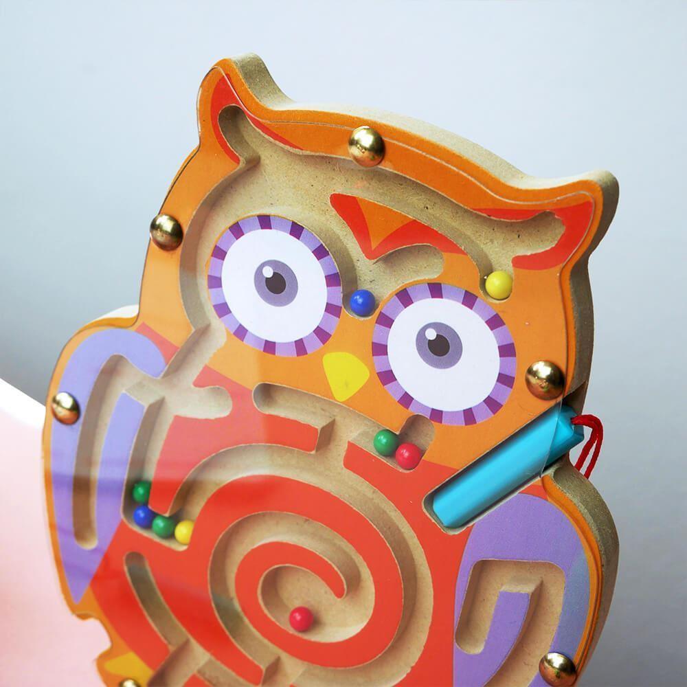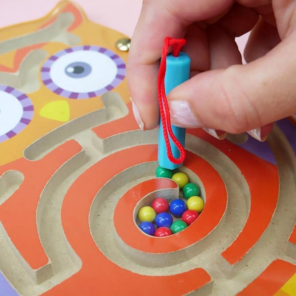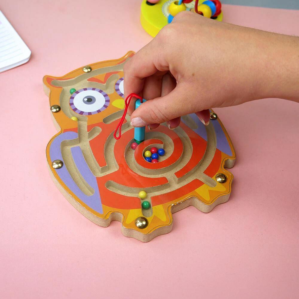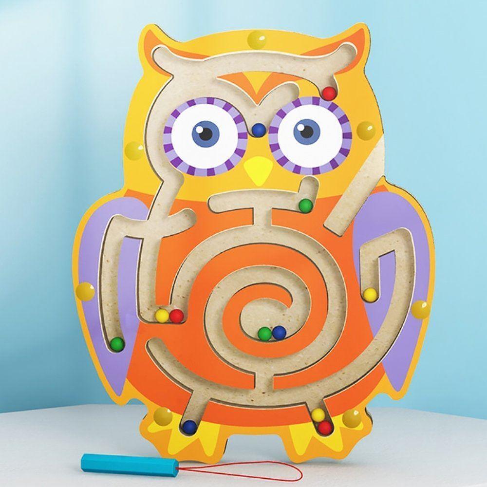 Magneticki labirynt to doskonała układanka dla dzieci. Wykonana jest w kolorowym motywie radosnego zwierzątka, co przyciąga uwagę dzieci od pierwszego wejrzenia! Ale dopiero podczas gry zaczyna się prawdziwa zabawa! Dzieci starają się przesuwać kuleczki w labiryncie za pomocą magnetycznego długopisu. Podczas zabawy rozwijają swoją motorykę i logiczne myślenie. Reguły gry można sobie wybrać samemu. Można na przykład sortować kuleczki według kolorów lub przemieszczać je na czas. Poprzez różne ruchy z kuleczkami uczą się rozwiązywać problemy i skupiać się. I to wszystko bez jakiegokolwiek długiego zmuszania do zabawy! Pomóż dzieciom pobudzić swoje mózgowe nitki i wyćwiczyć zręczne rączki! Dzieci na pewno docenią także naturalny materiał drewniany, który nadaje labiryntowi naturalny charakter.