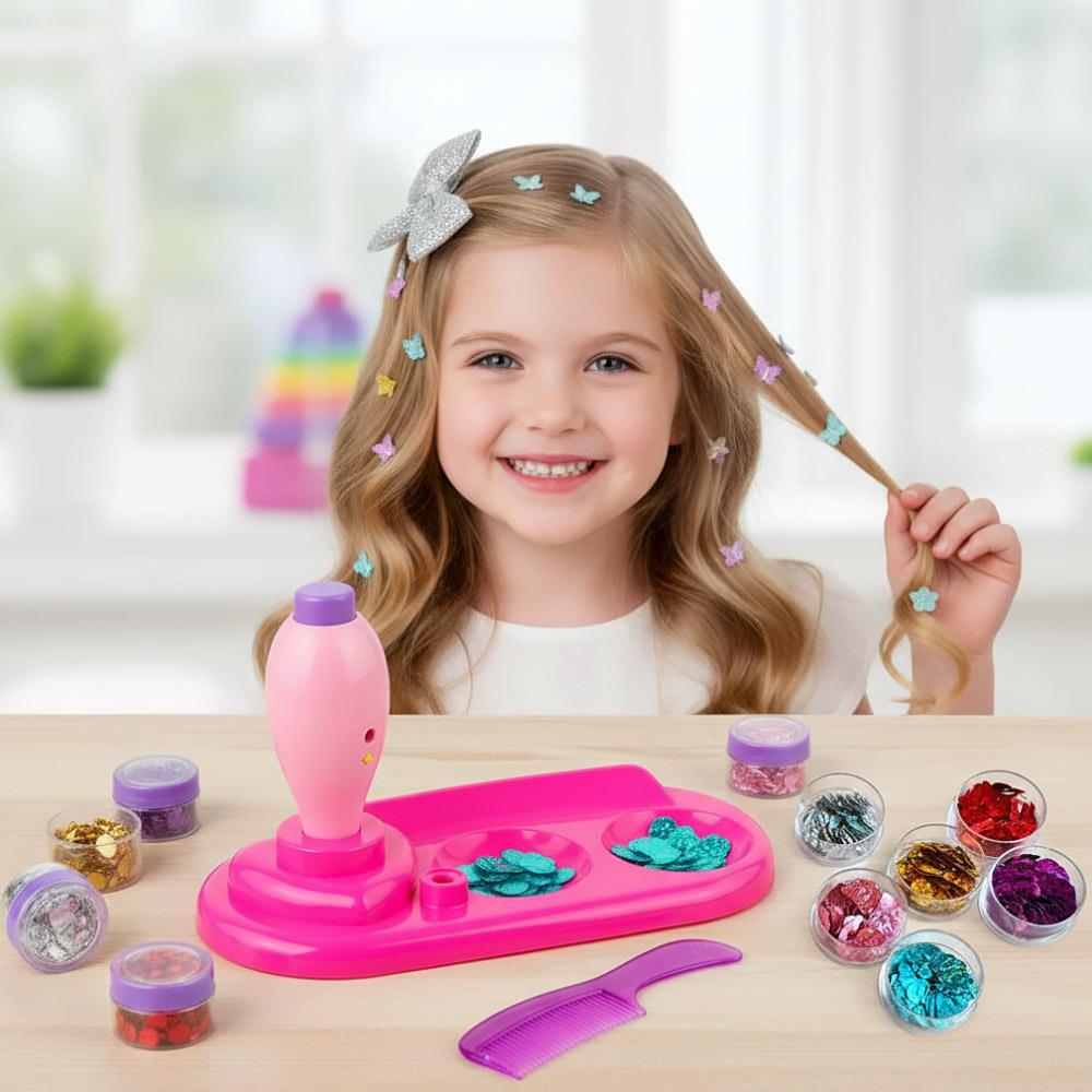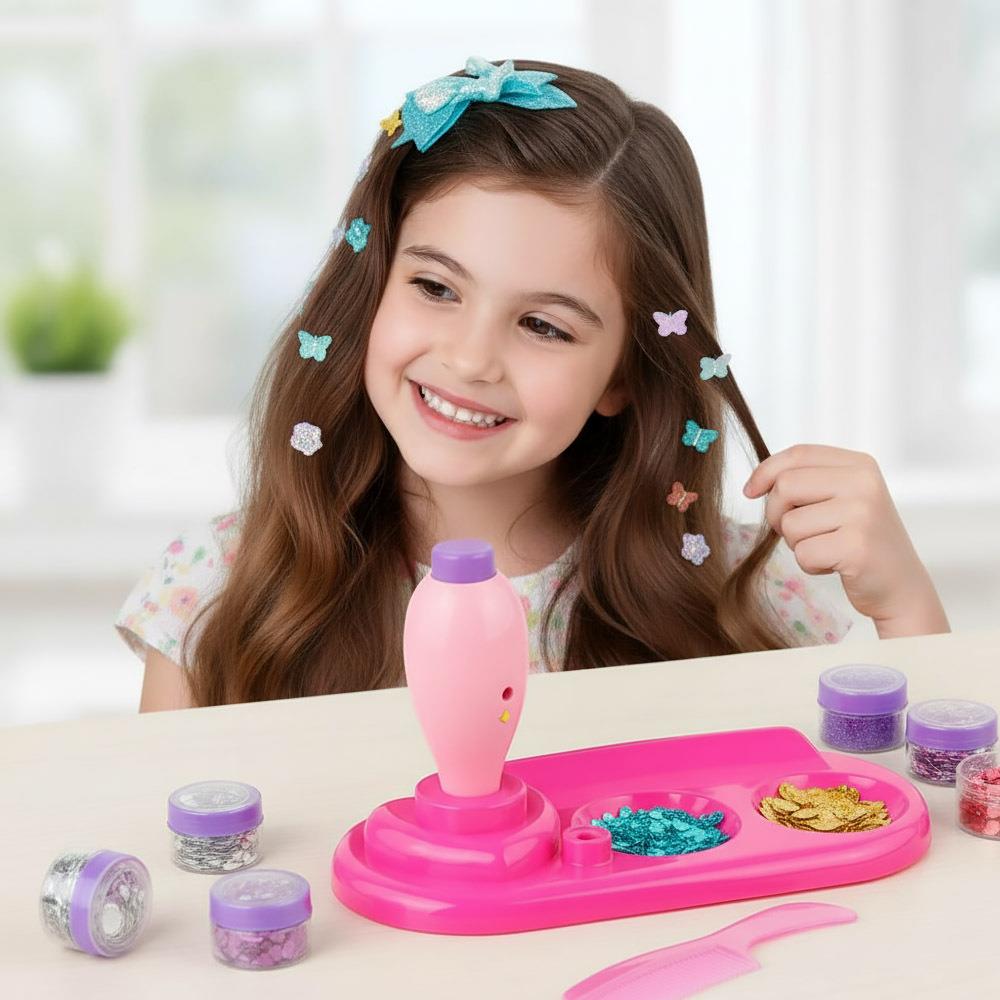 Wystarczy tylko wybrać konkretny brokat, umieścić go na wypustce na stoliku roboczym, zatrzasnąć w przyrządzie, a potem już tylko przy pomocyz urządzenia przymocować go w wybranym miejscu we włosach. Kiedy brokat się znudzi lub nadejdzie czas na nową fryzurę, łatwo go wyczeszesz z włosów. Co więcej, brokat można używać wielokrotnie, więc zawsze będziesz mieć go pod dostatkiem, na przykład do tworzenia wyszukanych fryzur razem z przyjaciółkami. Mnóstwo zabawy i piękne włosy? Dzięki temu przyrządowi gwarantowane!