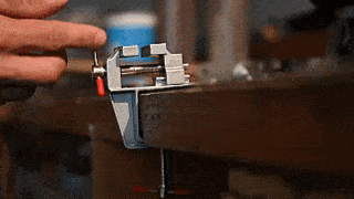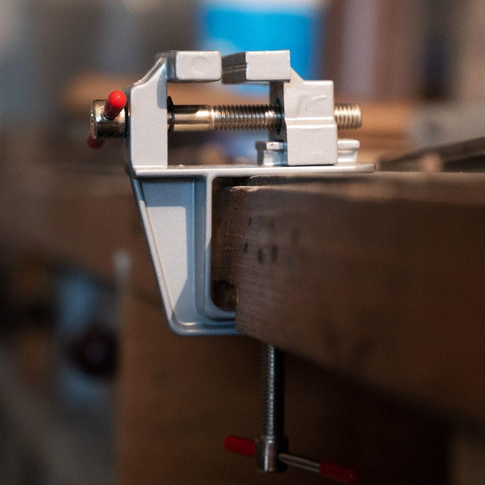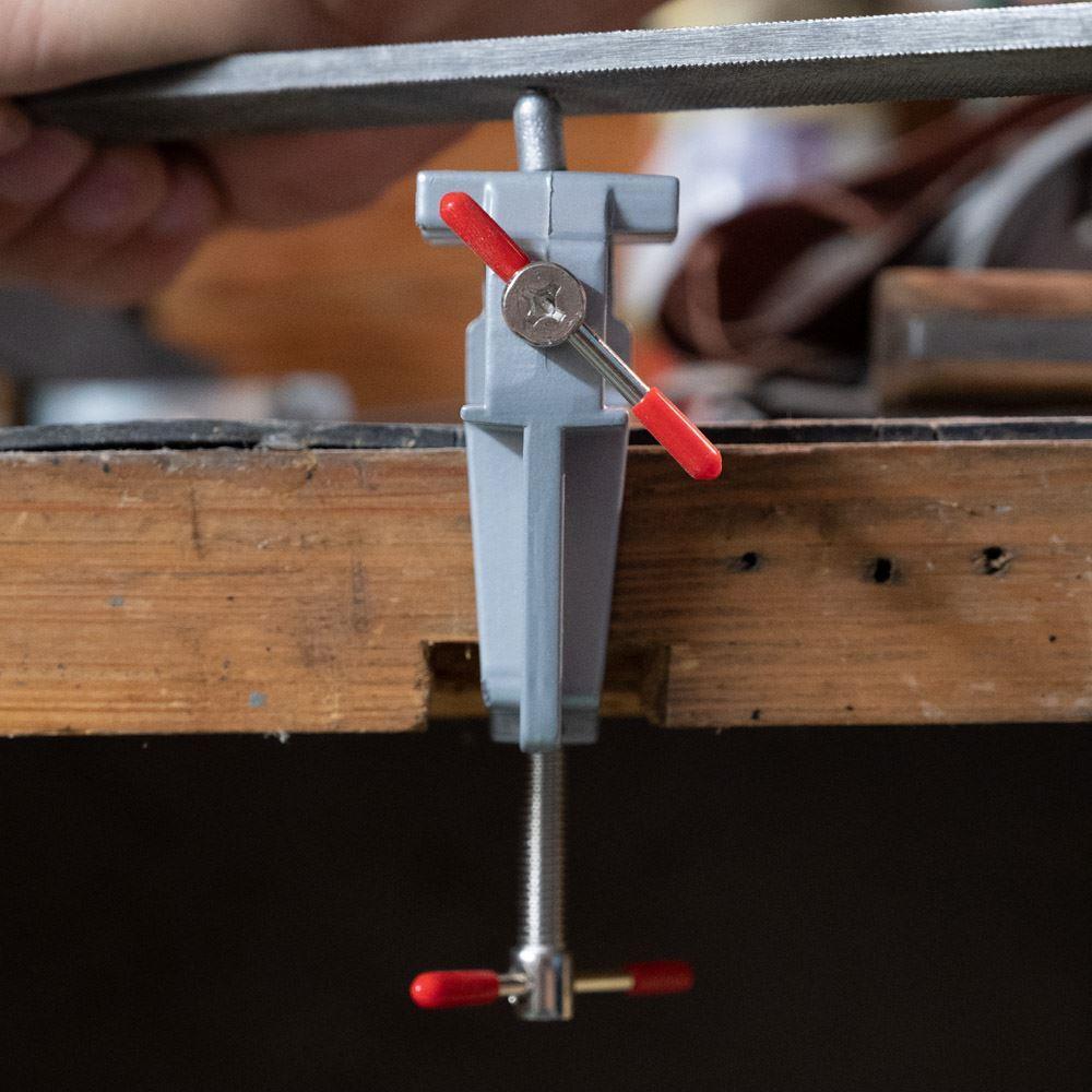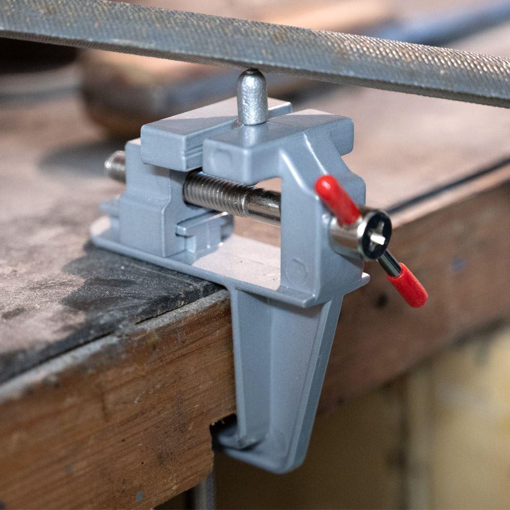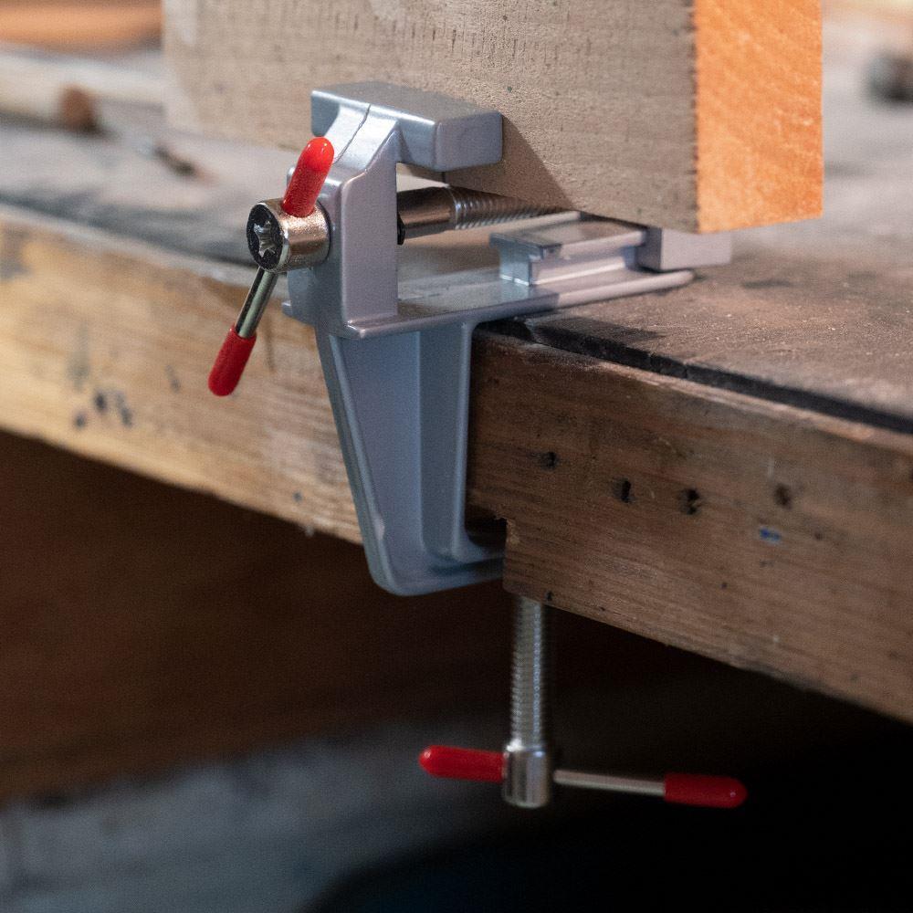 Potrzebujesz zeszlifować mały kawałek metalu lub wyciąć dziurkę w drewnie? Do wszelkich precyzyjnych prac doskonale nadaje się mini imadło. Przymocujesz je do blatu roboczego i możesz umieścić w nim przedmioty o wielkości do 2 cm.