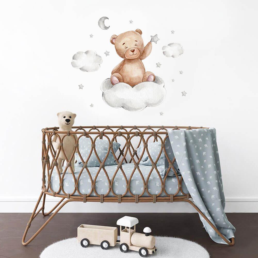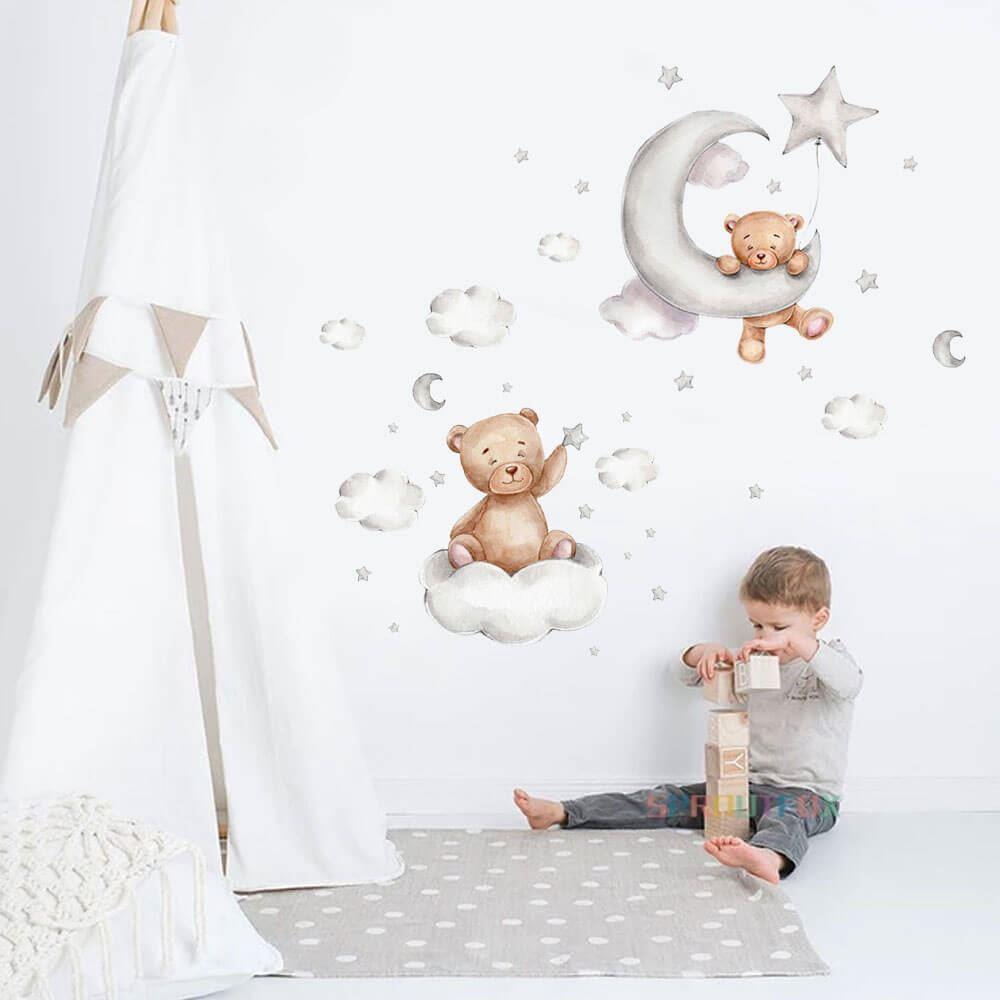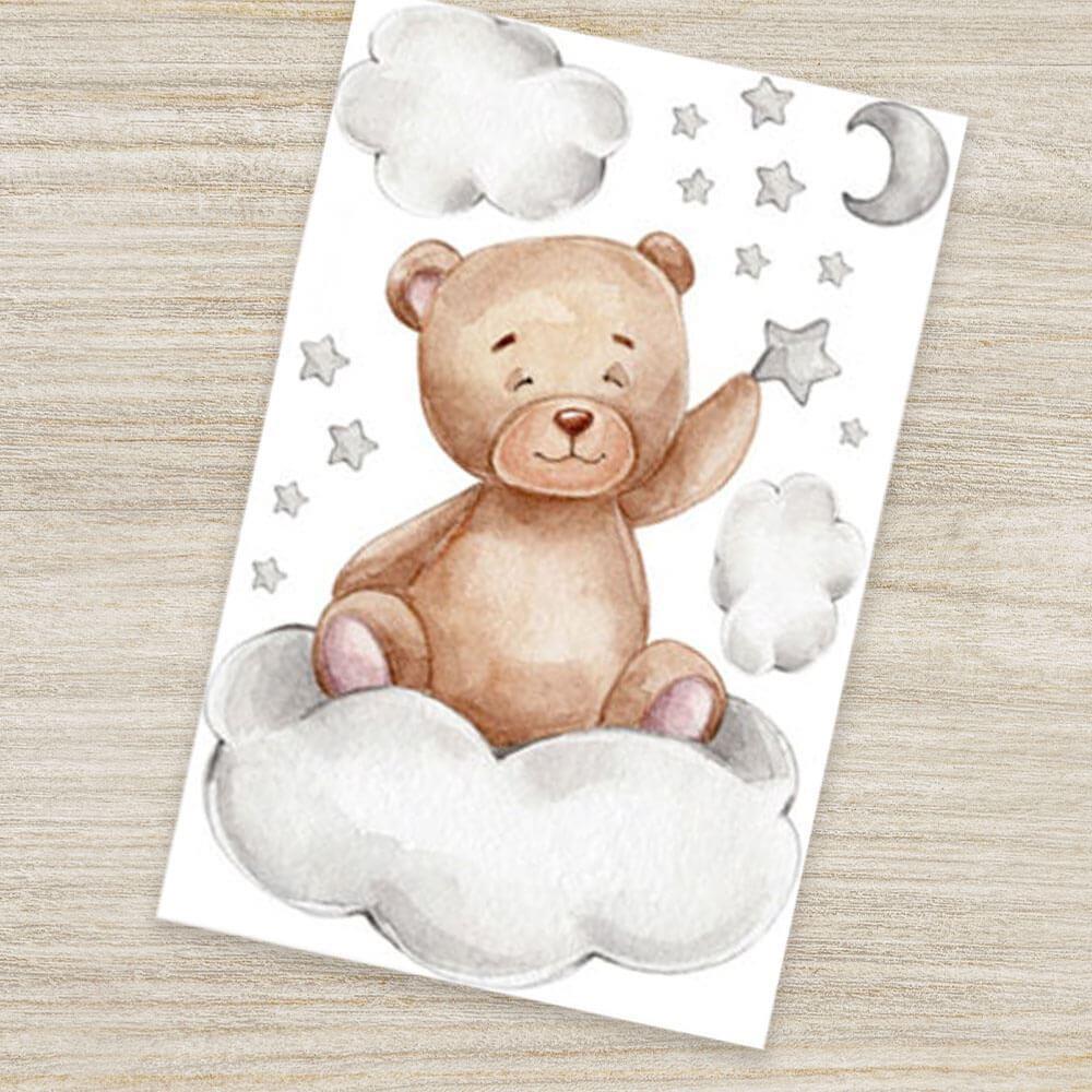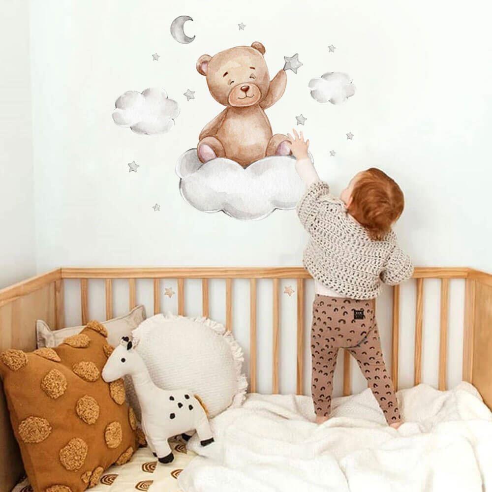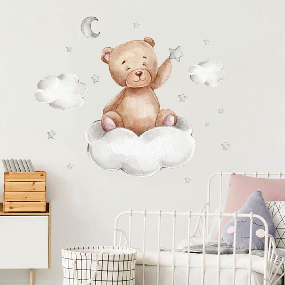 Doprowadź wystrój pokoju dziecięcego do perfekcji! Ten zestaw z uroczym misiem, chmurkami i gwiazdkami zachwyci każdego małego miłośnika misiów. Idealne miejsce na naklejenie to tuż nad dziecięcym łóżeczkiem. Miś będzie czuwał nad Twoim dzieckiem i zasypiał razem z nim. Naklejka z misiem pięknie pobudzi dziecięcą wyobraźnię zarówno podczas zasypiania, jak i zabawy.