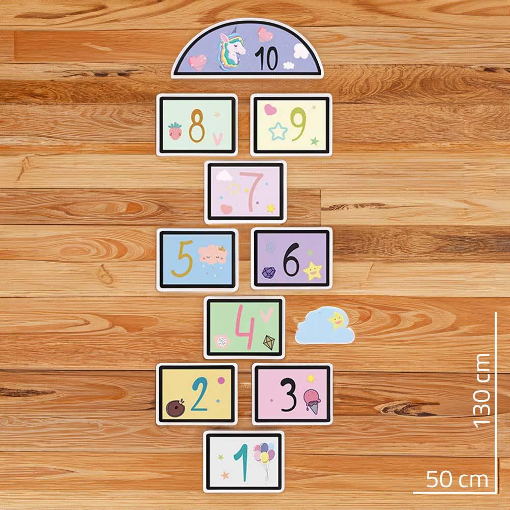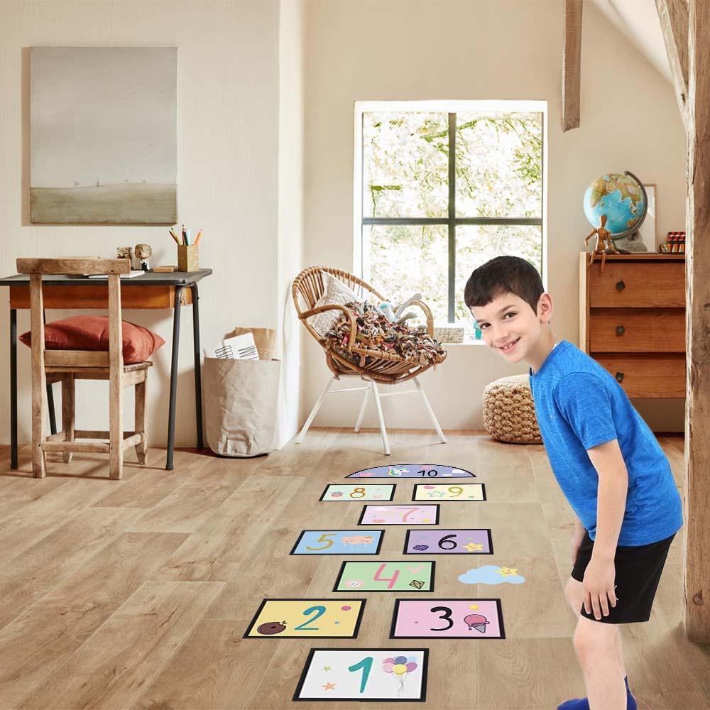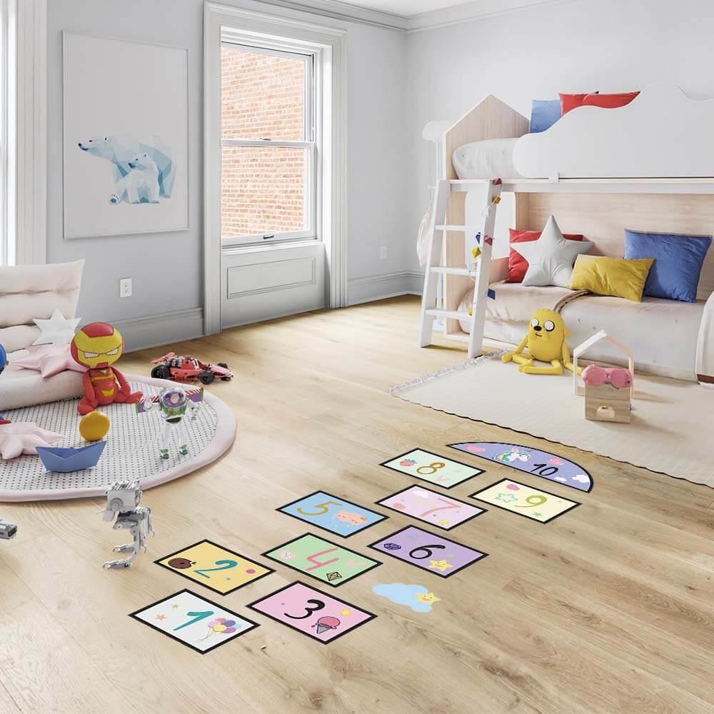 Po naklejeniu możecie cieszyć się mnóstwem zabawy! Zasady skakania w klasy na pewno już znacie, więc do dzieła. Nie tylko naklejka wspaniale ozdobi dziecięcy pokój, ale jednocześnie stworzy przestrzeń do zabawnej aktywności, podczas której dzieci ćwiczą motorykę dużą, prawidłową postawę ciała i koordynację.