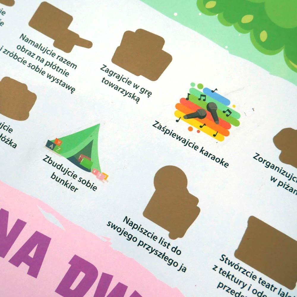 Na plakacie do zdrapywania wybieracie aktywność, którą zeskrobujecie. Potem wystarczy już tylko ruszyć na zewnątrz albo zrealizować wspólną aktywność w domu.