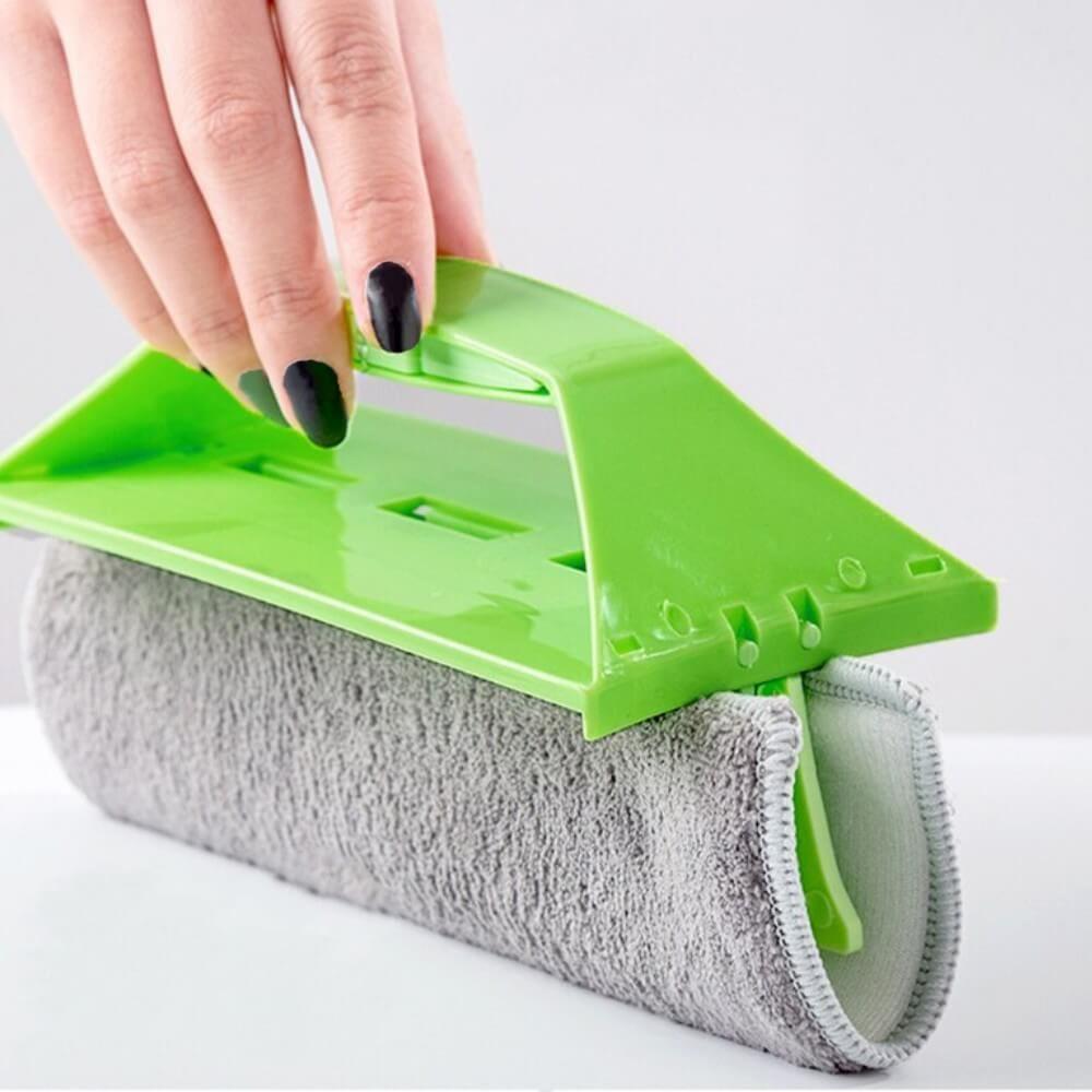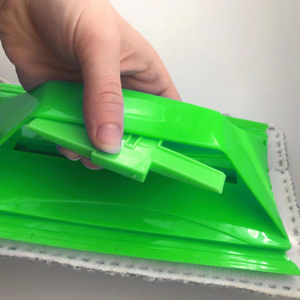 Jak to zrobić? Całą powierzchnię narzędzia można wykorzystać do mycia szyb okiennych. Po zdjęciu ściereczki dolną powierzchnię można podzielić (naciśnij ją w dół) i w zależności od tego, jak wąska jest szczelina przy oknie, można użyć obu powierzchni lub tylko jednej (załóż ściereczkę z powrotem). Ściereczka jest nieco dłuższa, dlatego zalecamy wyrównać ją z przednią częścią i pozostawić wystającą z tyłu. W szczelinie pod uchwytem znajdziesz szpatułkę.