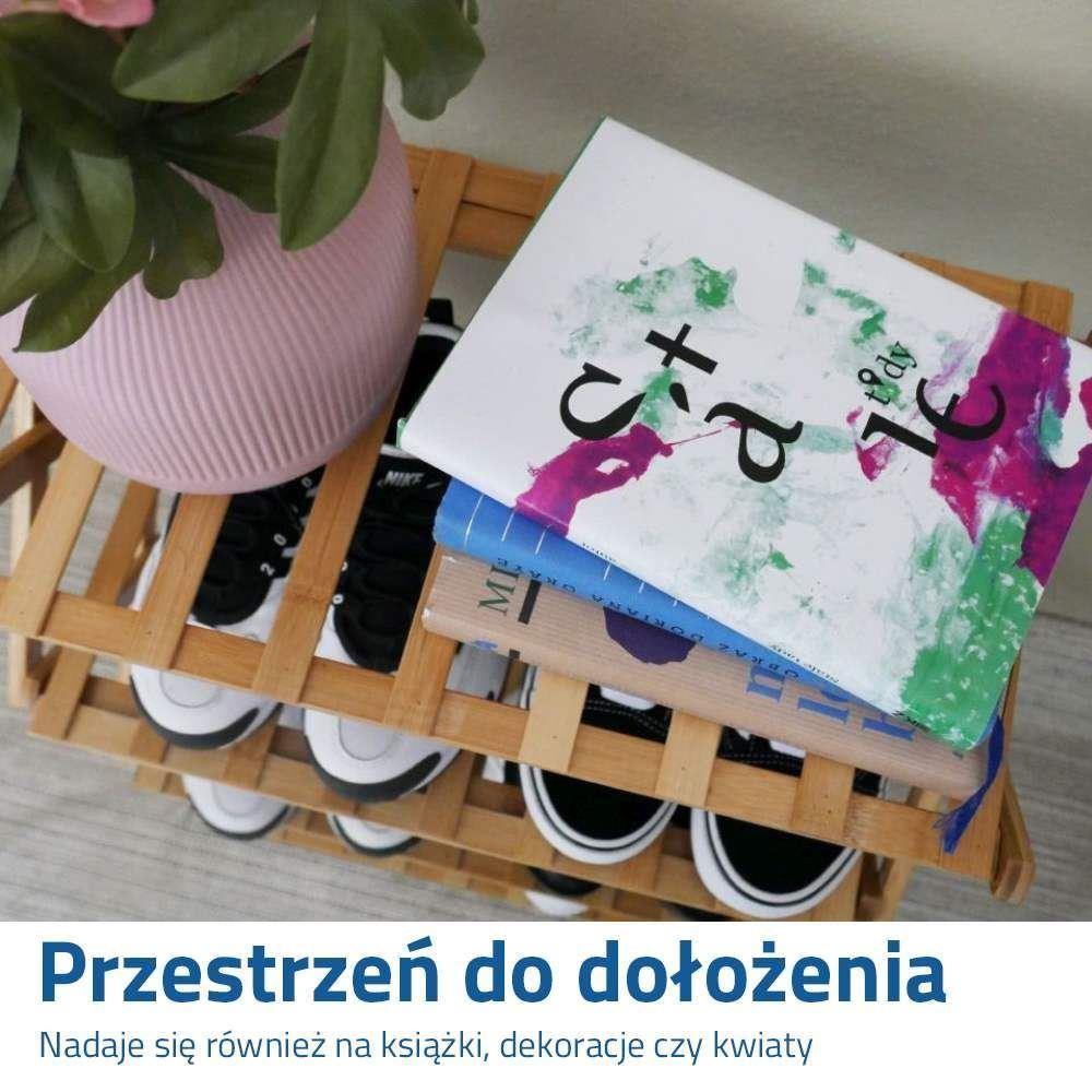Utrzymać porządek w domu można łatwo za pomocą drewnianego stojaka na buty. Praktyczny regał o designerskim wyglądzie z 4 półkami nadaje się nie tylko do uporządkowania pantofli i tenisówek. Można go ustawić na przykład w łazience, gdzie zorganizuje ręczniki, szlafroki lub kosmetyki. Przyda się także w pracowni jako półka na książki, dekoracje lub kwiaty.