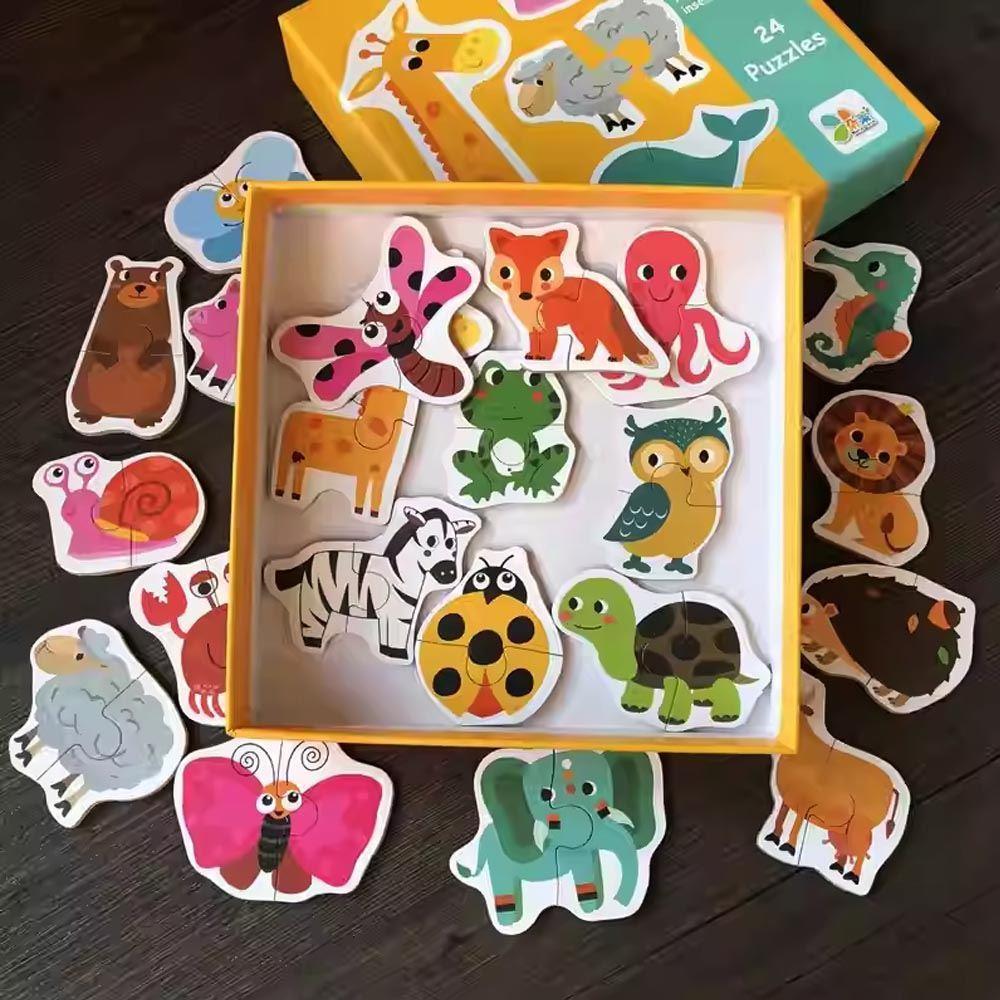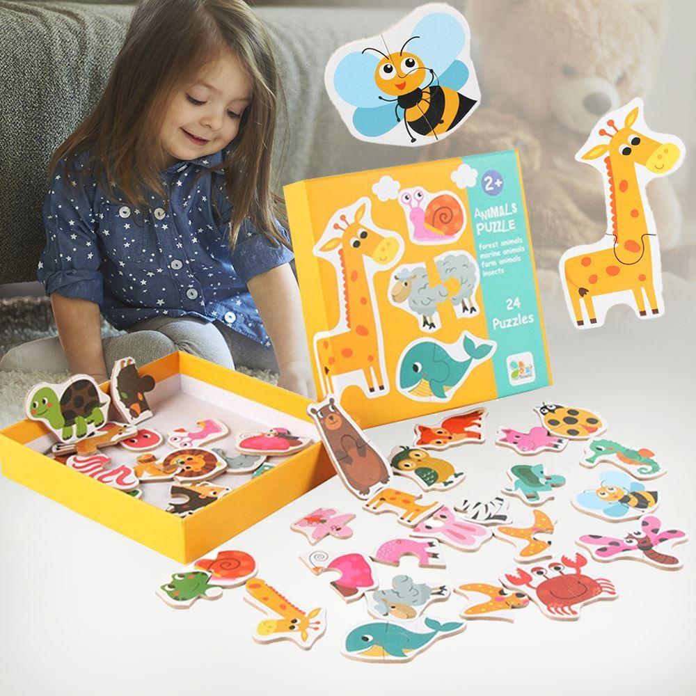 Zabawa i nauka w jednym. Dzieci z pewnością zachwyci uroczy wygląd poszczególnych zwierzątek. Ich ułożenie nie jest wcale trudne – każde zwierzątko składa się zawsze tylko z 2 elementów. Łącznie ułożysz 24 zwierzątka różnych gatunków – egzotycznych, morskich i domowych. Puzzle świetnie nadają się więc do nauki rozpoznawania różnych zwierzęcych przyjaciół, którzy żyją wśród nas.