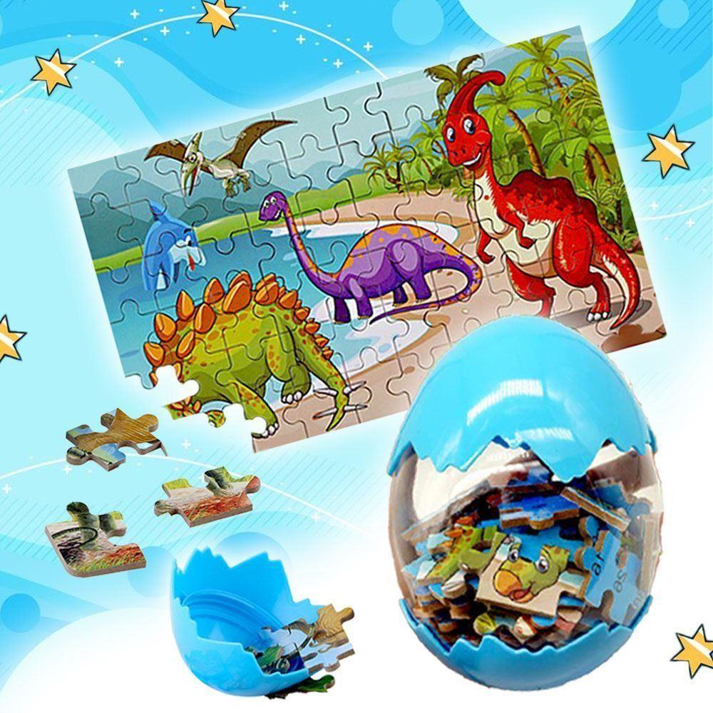 Puzzle, które nigdy nie przeminą! Świat dinozaurów przyciąga zarówno dziewczynki, jak i chłopców, dlatego z tym prezentem z pewnością nie popełnisz błędu. Dotrzyjcie do jajka i odkryjcie dinozaury w nim. Układanka w oryginalnym opakowaniu zawiera 60 elementów. Po złożeniu czekają na Was wesołe, kolorowe obrazki z dinozaurami. Poszczególne elementy są precyzyjne, więc świetnie się z nimi pracuje.