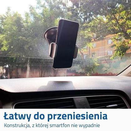 Uchwyt, który trzyma jak przybity? Nasz na pewno spełni Twoje oczekiwania. Jego prostą instalację opanuje każdy, dzięki przyssawce przymocujesz go i ustawisz w sekundę. Doskonale utrzyma się na desce rozdzielczej samochodu lub na przedniej szybie. Solidna konstrukcja niezawodnie utrzyma telefon, więc nie musisz obawiać się jego wypadnięcia. Posiada również funkcję obrotu o 360°.