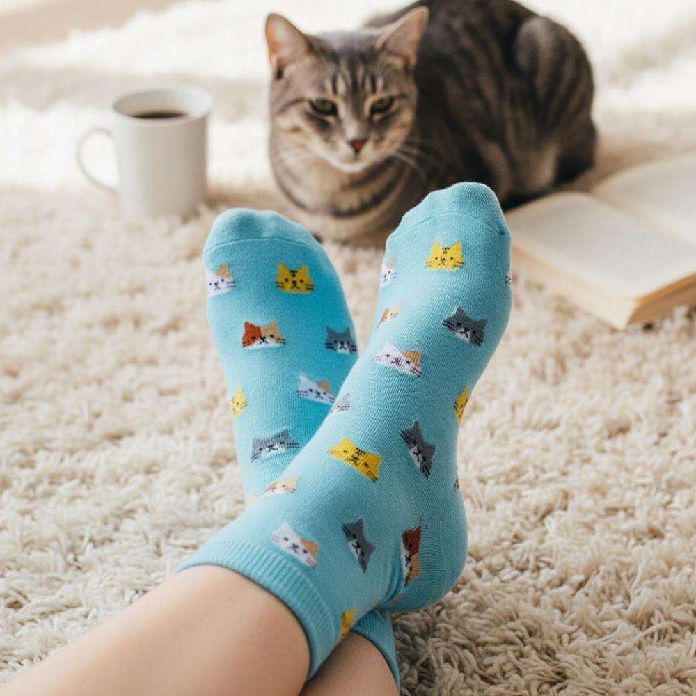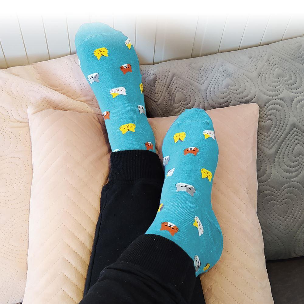 Grzejące skarpetki z pomysłem. Skarpetki z kotkami zachwycą każdego miłośnika kotów. Oryginalny wygląd z pewnością przyciągnie uwagę. Wesołe skarpetki nie tylko ogrzeją, ale też będą świetnie wyglądać. Wysoka jakość wykonania i przyjemny materiał sprawią, że będziesz nosić je z przyjemnością.