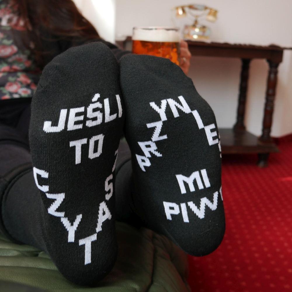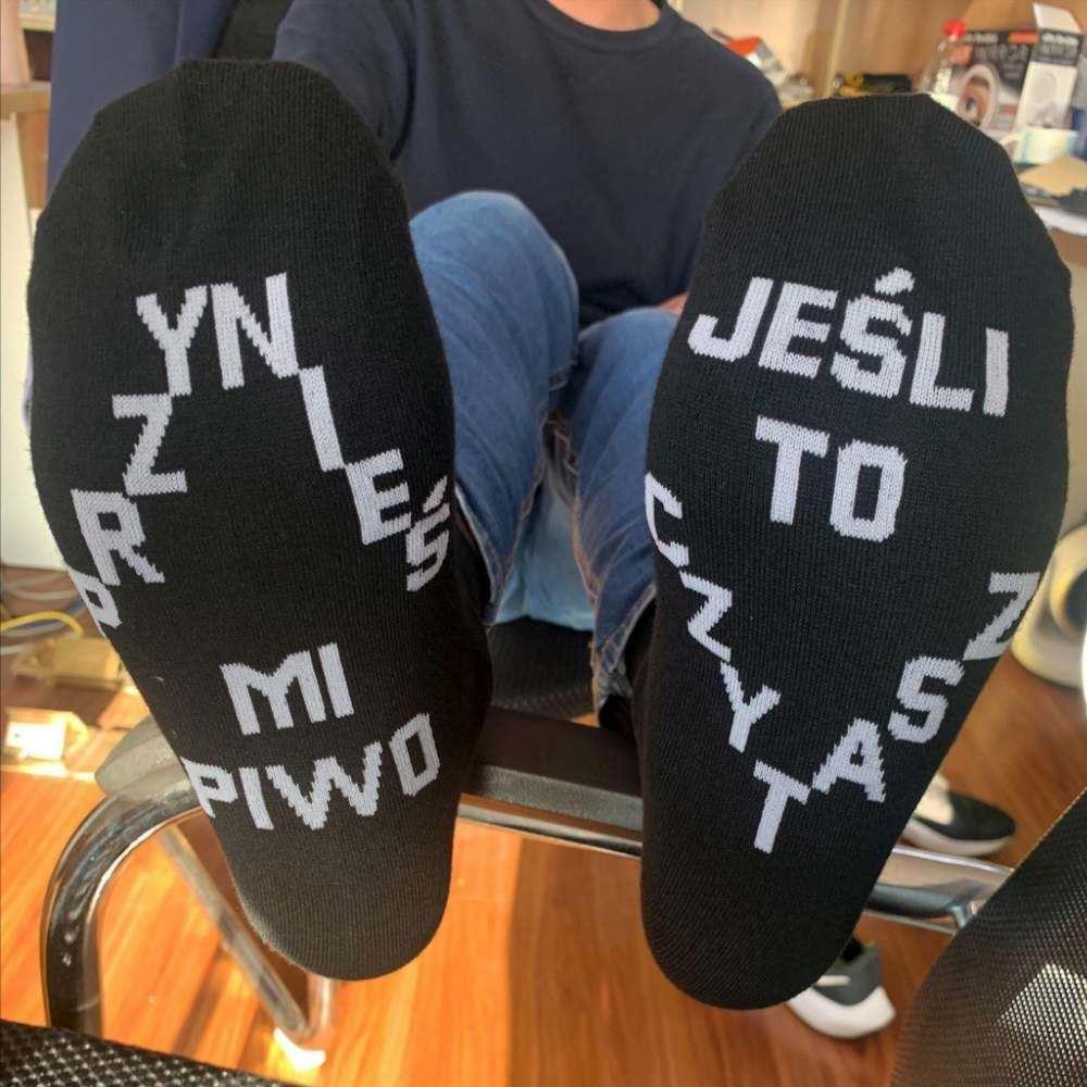 Skarpety z zabawnym napisem są zawsze świetnym pomysłem na prezent. Skarpetki „przynieś mi piwo“ na pierwszy rzut oka nie są ciekawe i wyglądają jak klasyczne czarne skarpetki. Ale pozory mylą.