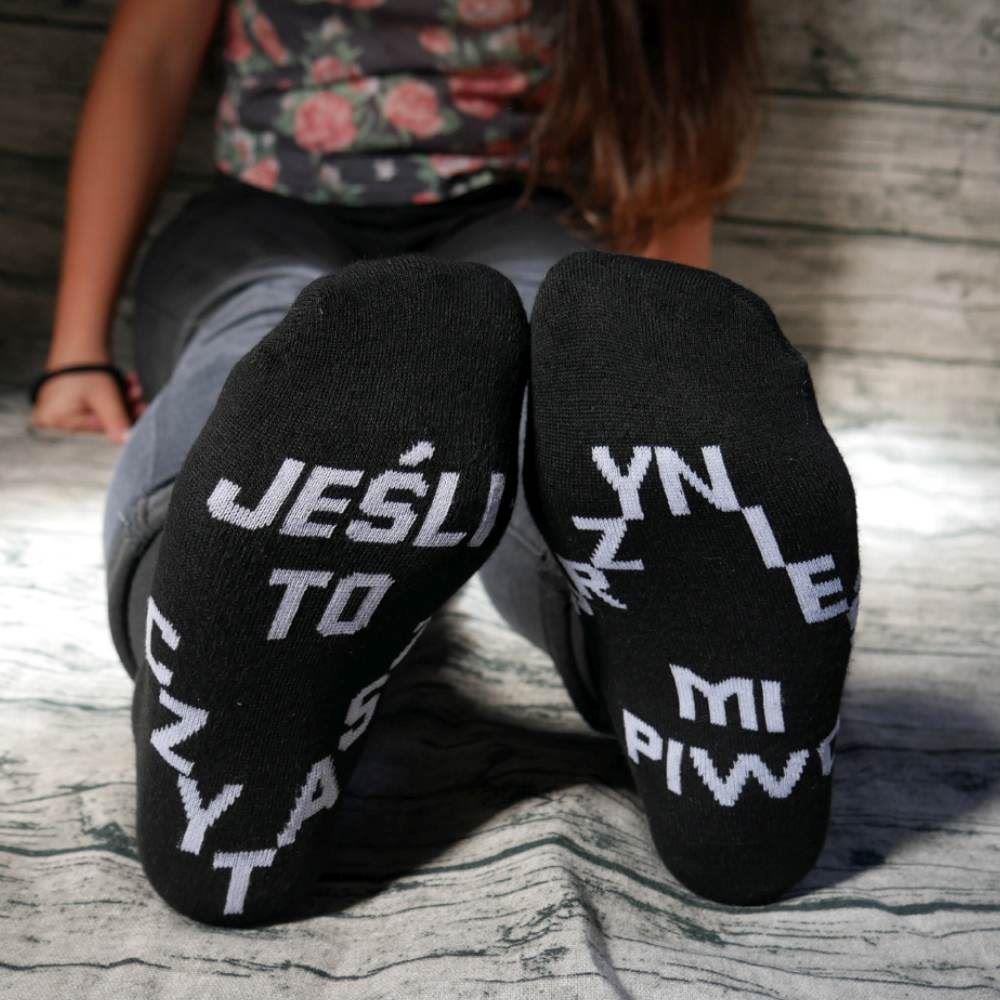 Dolną część skarpetek wyróżnia zabawny i wesoły napis. Na pierwszej skarpetce jest napisane: „Jeśli to czytasz“ a na drugiej: „Przynieś mi piwo“. Śmieszne skarpetki są odpowiednim prezentem zarówno dla mężczyzn, jak i kobiet, ponieważ mają uniwersalny rozmiar. Są wygodne do noszenia dzięki przyjemnemu materiałowi.