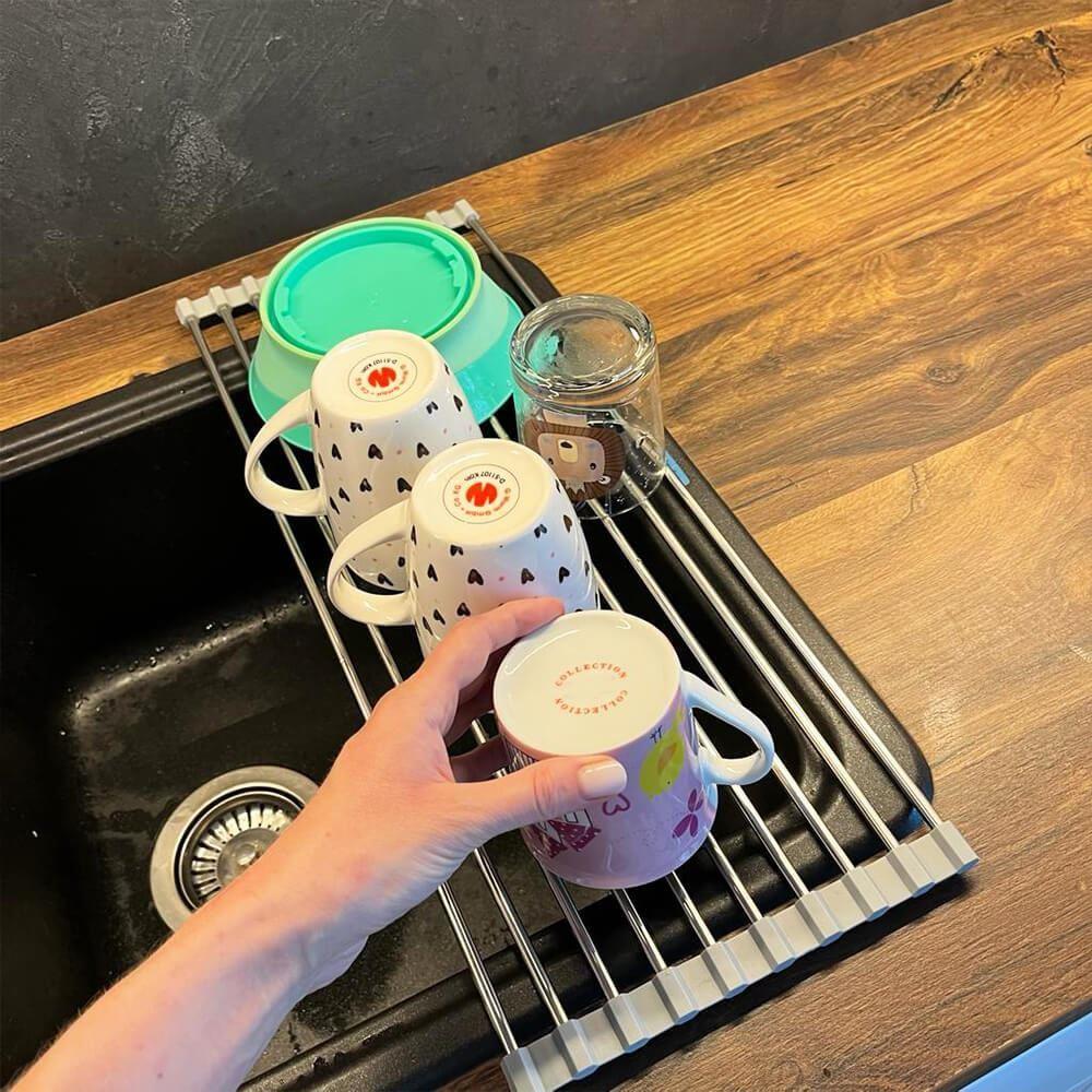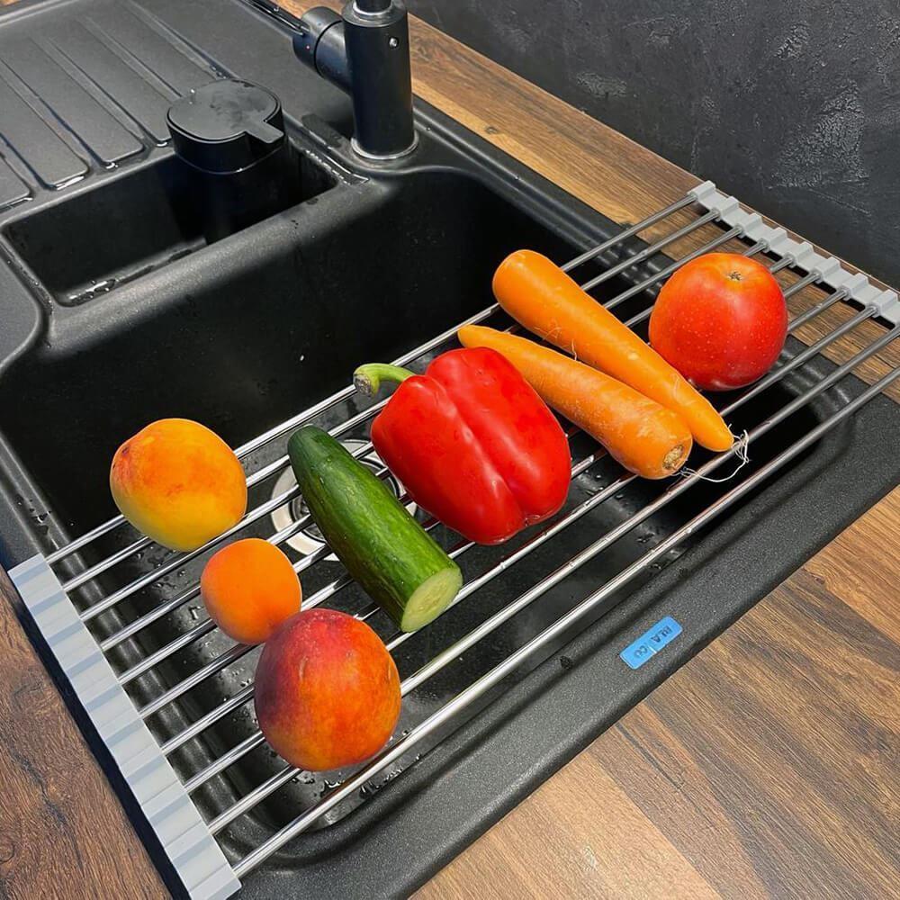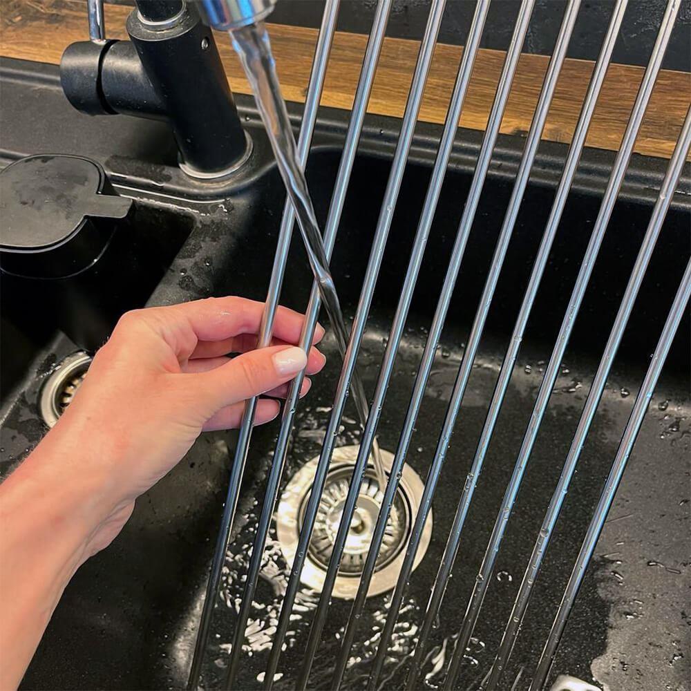 Ociekaczka jest łatwa do rozkładania i składania. Do jej użycia nie potrzebujesz żadnych narzędzi – wystarczy rozłożyć i położyć na zlewie. Po użyciu możesz ją zwinąć w rulon i schować gdziekolwiek zechcesz. Zajmuje minimalną ilość miejsca i zawsze możesz mieć ją pod ręką.