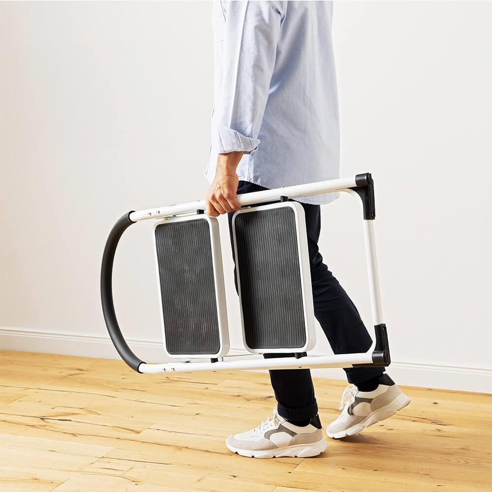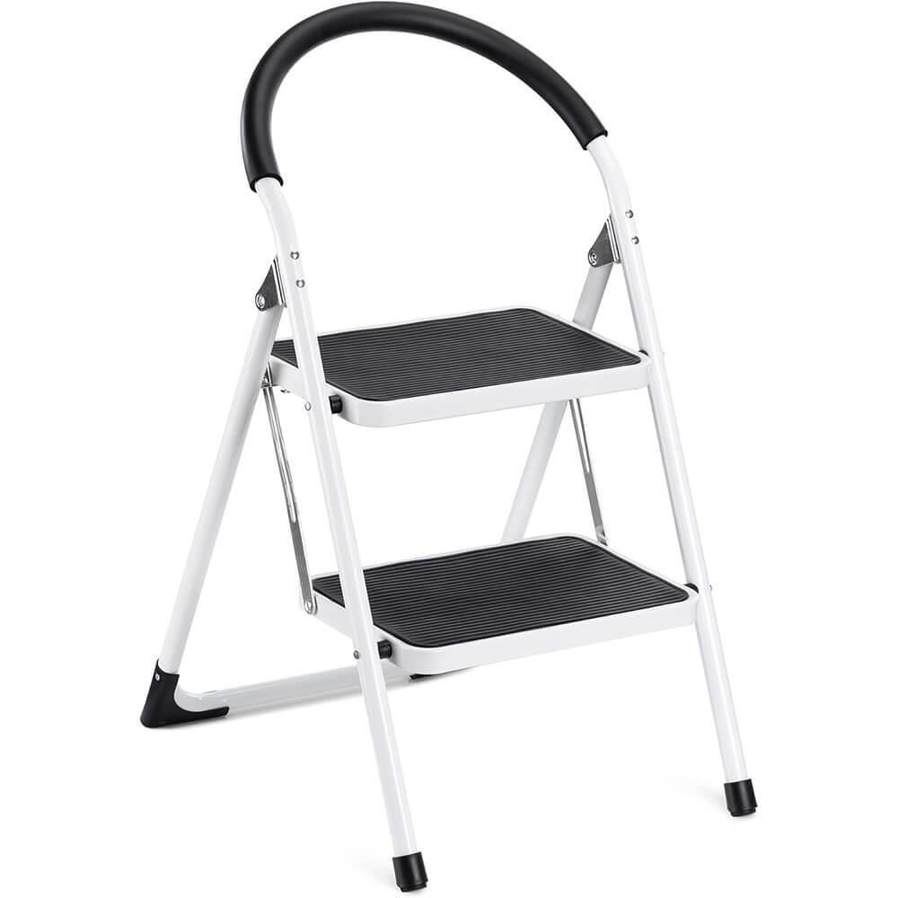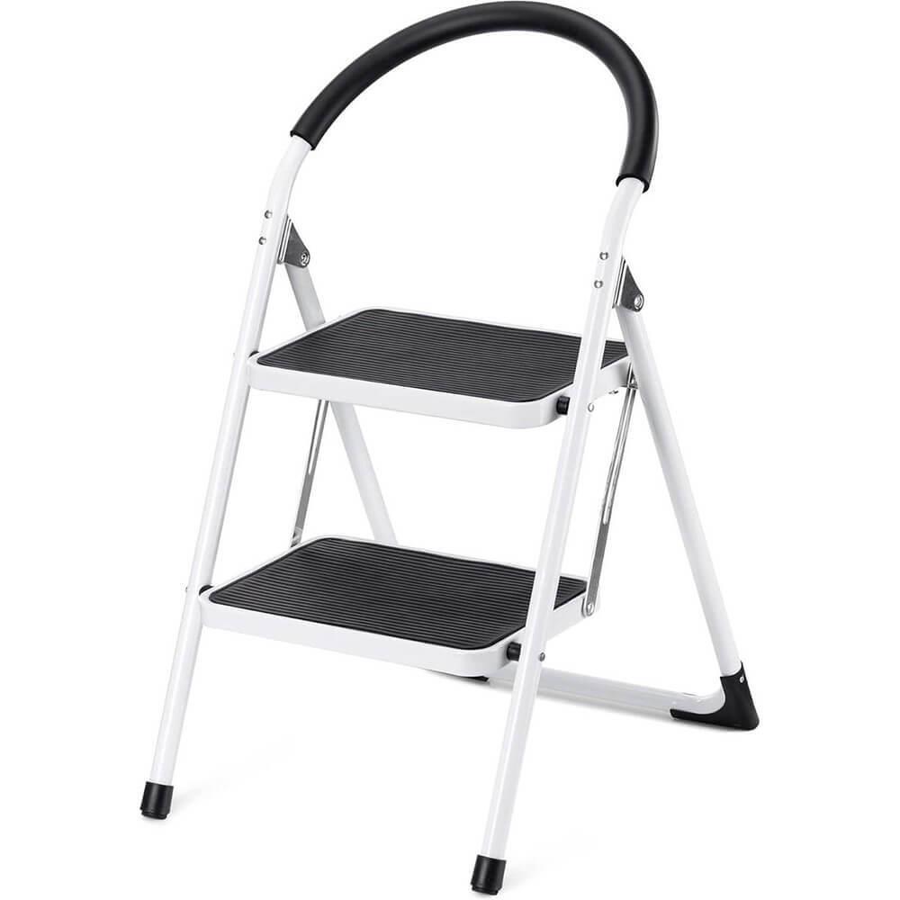 Dzięki stabilnej metalowej konstrukcji schodki są trwałe, a antypoślizgowe stopnie i gumowe nóżki zapewniają maksymalne bezpieczeństwo podczas użytkowania. Ergonomiczna poręcz zapewnia wsparcie przy wchodzeniu i schodzeniu.