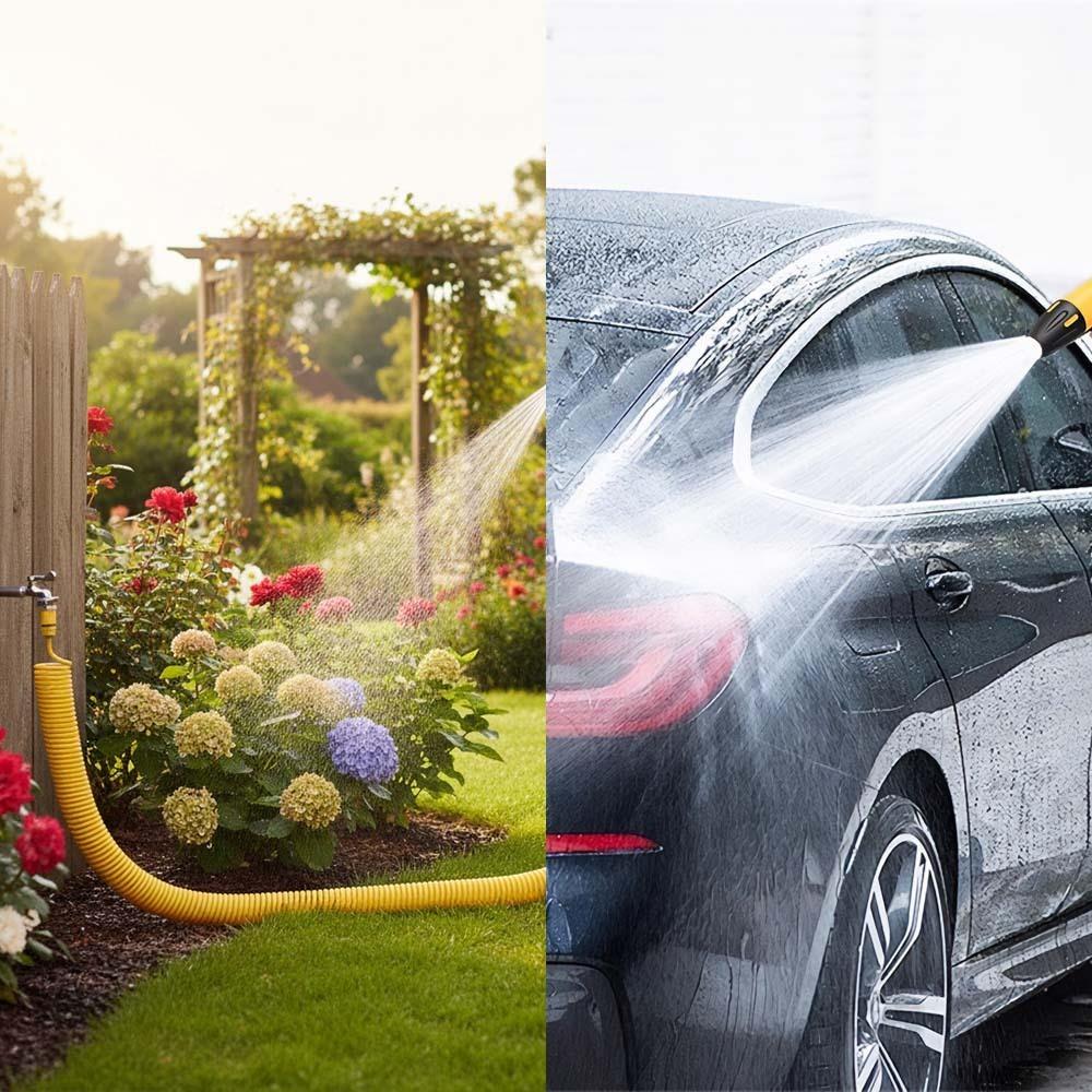 W zestawie znajduje się praktyczny pistolet, którym możesz dostosować strumień wody w zależności od tego, czy podlewasz kwiaty, spłukujesz taras czy myjesz rower. Dzięki szybkozłączkom podłączenie do sieci wodociągowej jest szybkie i wygodne, a w zestawie znajdują się również końcówki do podłączenia do kranu. Ważne: to nie myjka ciśnieniowa – to klasyczny wąż zwinięty w spiralę, przeznaczony do zwykłego użytku ogrodowego.