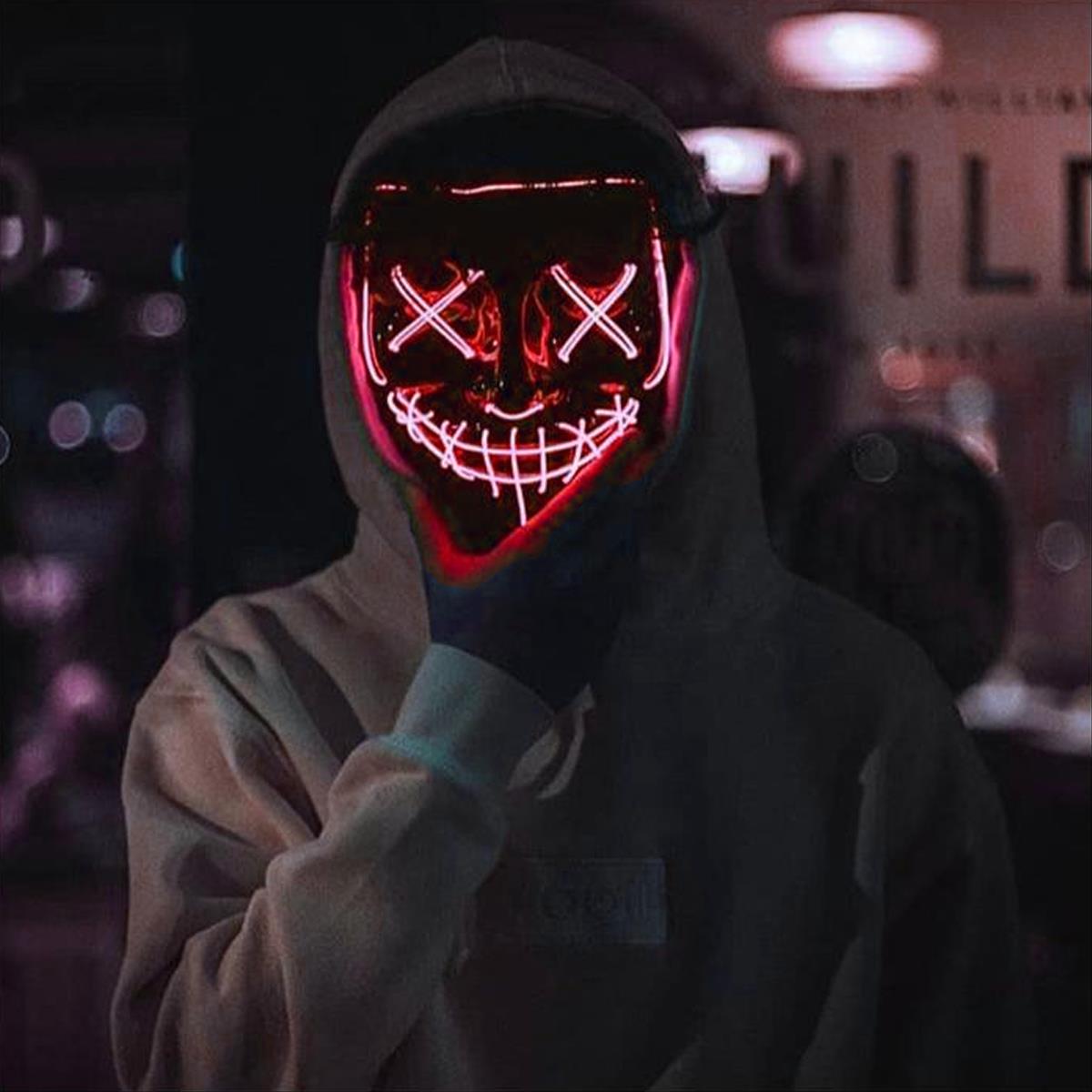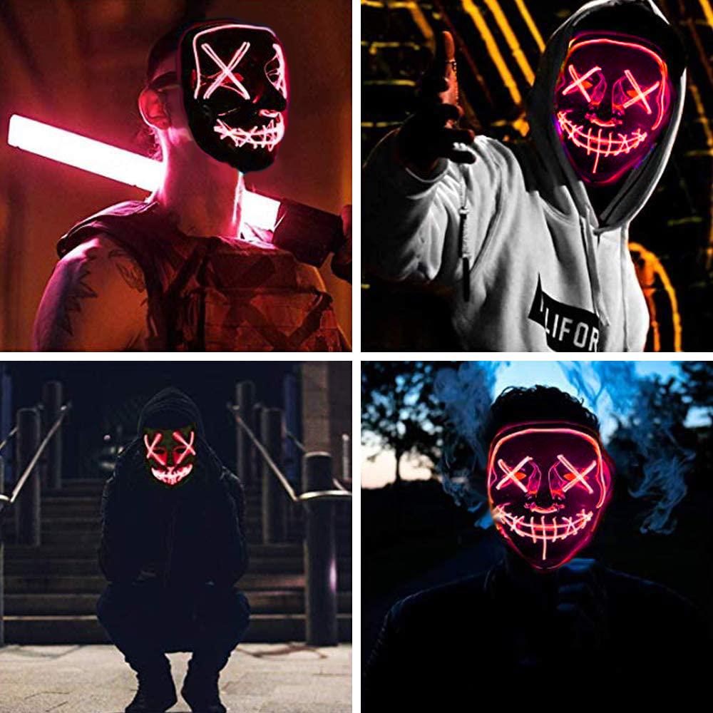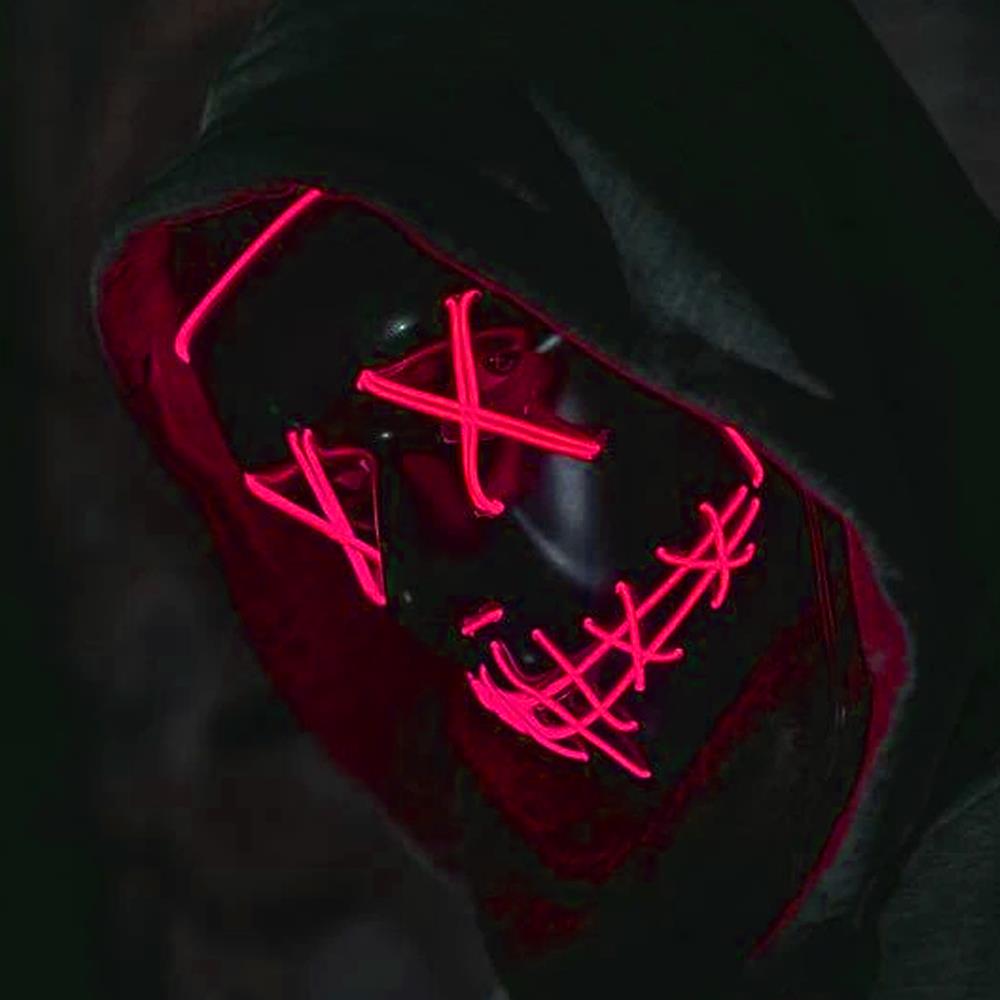 Maska ma 3 tryby świecenia. Świeci, powoli miga lub szybko miga. Tryb świecenia łatwo przełącza się przyciskiem na pokrywie baterii. Pokrywkę z bateriami można zawiesić na pasku lub schować do kieszeni.