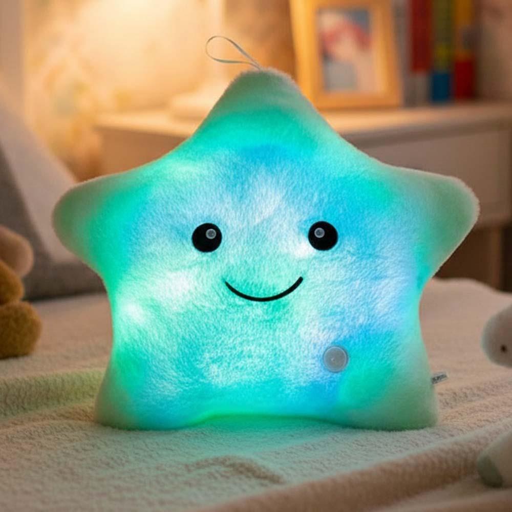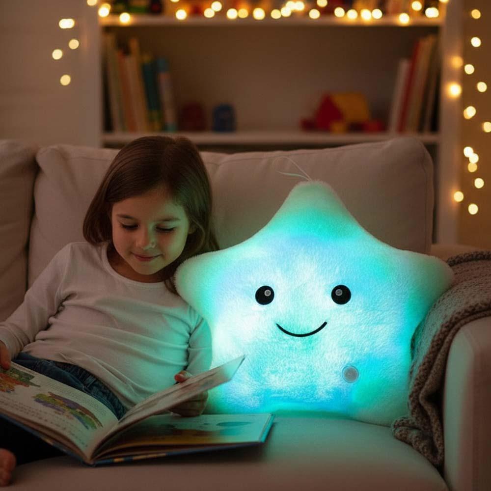 Urocza poduszka w kształcie gwiazdki od razu przypadnie do gustu twoim dzieciom. Mogą z nią bez problemu zasypiać, jest wykonana z przyjemnego materiału. Najbardziej docenią to, że poduszka świeci. Aby ją włączyć, wystarczy włożyć baterie i nacisnąć przycisk na poduszce.