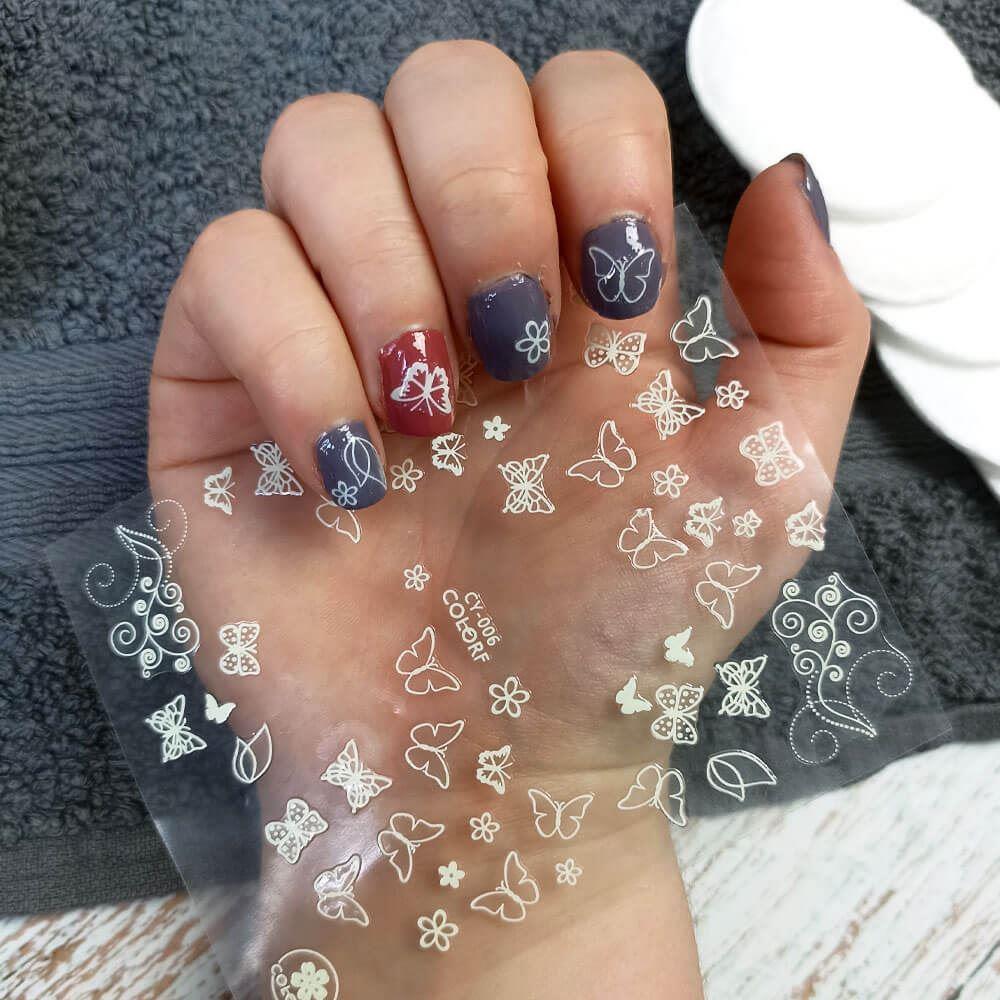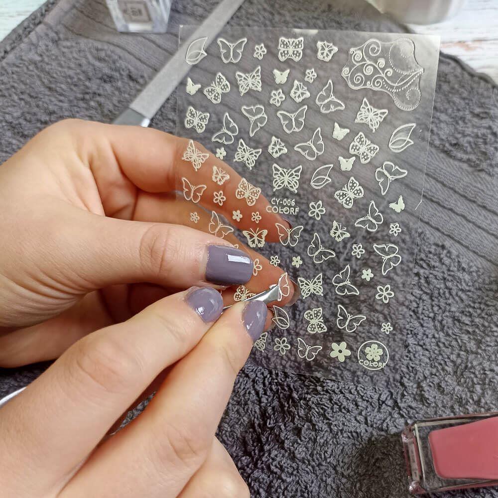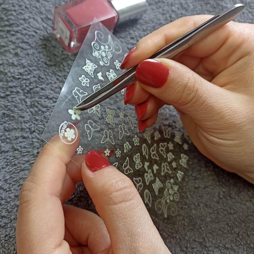 Naklejki można naklejać na bazową warstwę lakieru lub bezpośrednio na paznokieć. Nadają się zarówno do paznokci naturalnych, jak i sztucznych. Naklejkę wystarczy chwycić pęsetą i nałożyć na paznokieć. Po przyklejeniu zaleca się zabezpieczyć naklejki końcową warstwą przezroczystego lakieru.