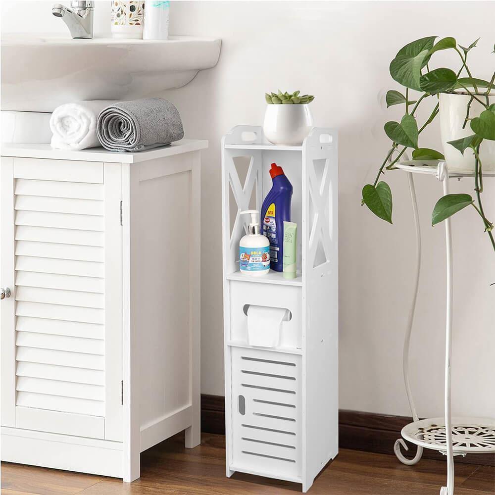 Szafka oferuje otwarte półki dla szybkiego dostępu do codziennie używanych rzeczy, takich jak kosmetyki, ręczniki lub środki czystości. Wbudowany uchwyt na papier toaletowy oraz zamykana szafka umożliwiają dyskretne przechowywanie produktów higienicznych.