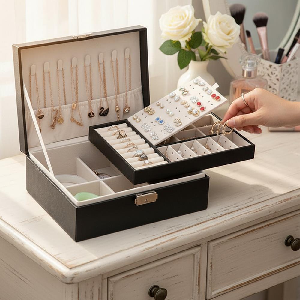 Maxi szkatułka na biżuterię zapewnia przejrzyste uporządkowanie twojej biżuterii. Ma dużą przestrzeń do przechowywania, więc bez problemu zmieścisz w niej całą swoją biżuterię, którą masz w domu. Bransoletki, łańcuszki, kolczyki i pierścionki są razem, przy czym na każdy rodzaj biżuterii jest specjalna i oddzielona przestrzeń. Nie nastąpi sytuacja, w której twoje łańcuszki się poplączą. Na górnej stronie znajduje się bowiem miejsce do zawieszenia pojedynczych łańcuszków.