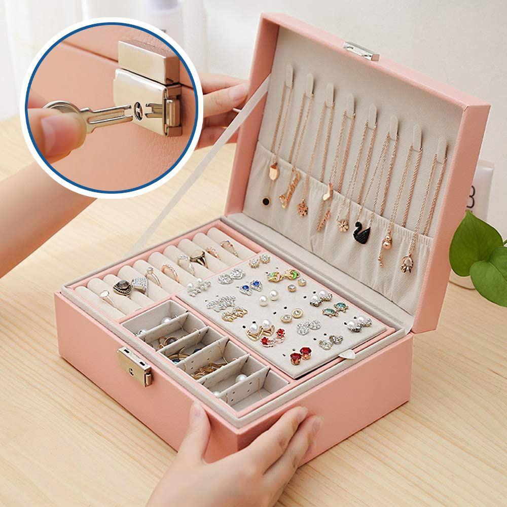 Maxi szkatułka na biżuterię zapewnia przejrzyste uporządkowanie twojej biżuterii. Ma dużą przestrzeń do przechowywania, więc bez problemu zmieścisz w niej całą swoją biżuterię, którą masz w domu. Bransoletki, łańcuszki, kolczyki i pierścionki są razem, przy czym na każdy rodzaj biżuterii jest specjalna i oddzielona przestrzeń. Nie nastąpi sytuacja, w której twoje łańcuszki się poplączą. Na górnej stronie znajduje się bowiem miejsce do zawieszenia pojedynczych łańcuszków.