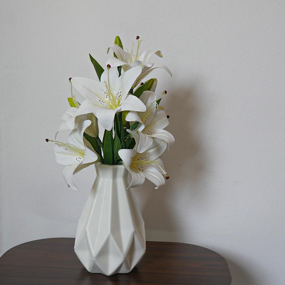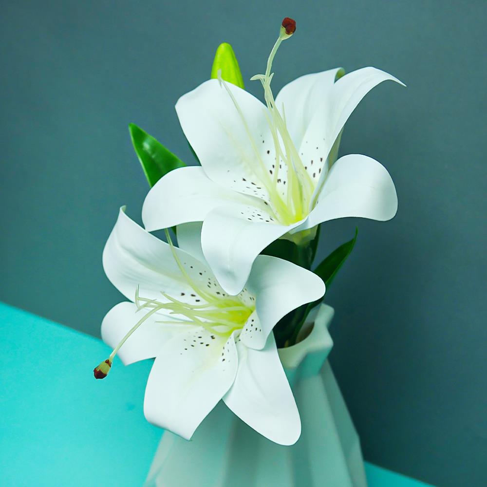 Sztuczny bukiet lilii to doskonałe rozwiązanie dla tych, którzy kochają kwiaty, ale nie mają czasu, aby o nie dbać. Dzięki realistycznemu wyglądowi sprawiają wrażenie świeżo ciętych kwiatów. Kwiaty są bogate, delikatnie kolorowe i szczegółowo wykonane. Bukiet nie wymaga żadnej pielęgnacji, więc możesz cieszyć się jego pięknem cały czas.