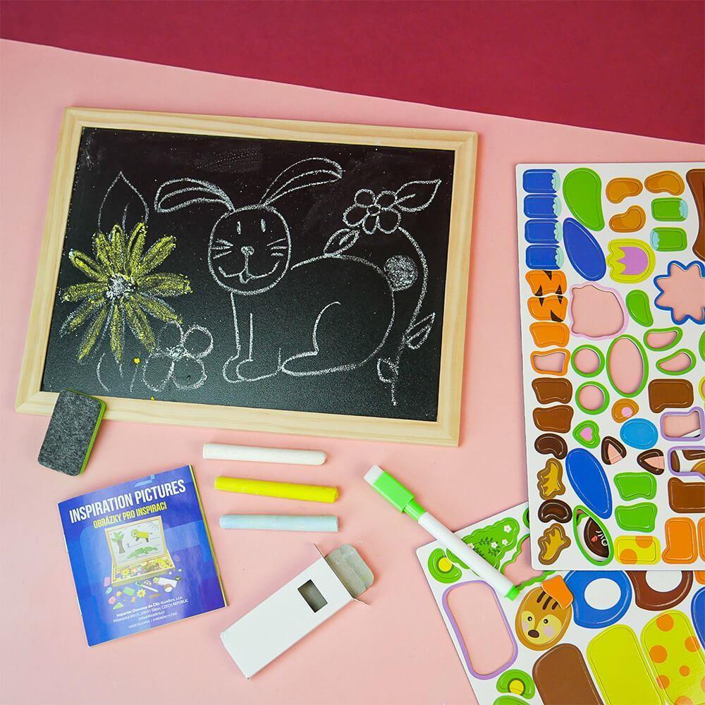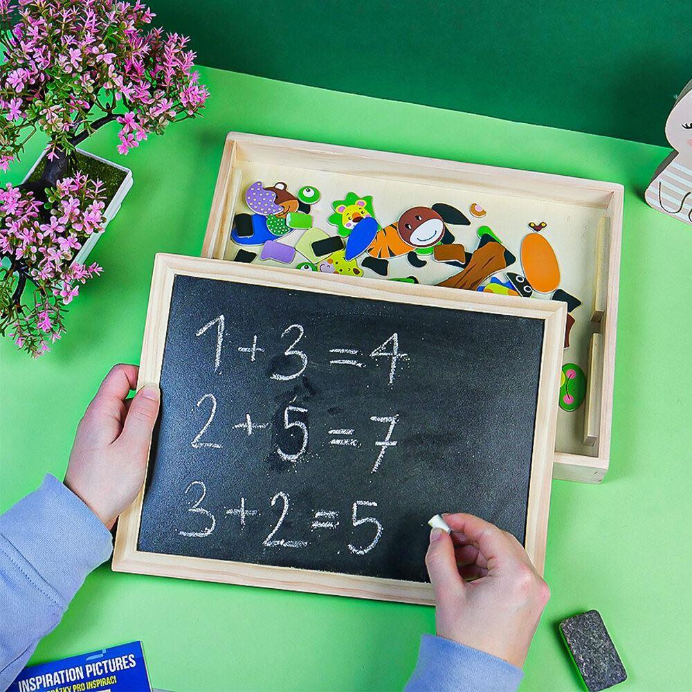 Rozkładany stolik dla dzieci. Świetna zabawka dla dzieci od 3 lat. Tablica jest dwustronna – po jednej stronie można pisać markerem, po drugiej kredą. Tablicę można jednak wykorzystać także inaczej. W zestawie znajduje się komplet magnesów z dziecięcymi motywami. Dzieci mogą układać różne obrazki, kształty lub wymyślać rozmaite historyjki. Dodatkowo tablicę można łatwo rozkładać i składać. W zestawie znajduje się wszystko, co najważniejsze. Znajdziesz tam kredy, specjalny marker, gąbkę i komplet magnesów z różnymi dziecięcymi motywami.