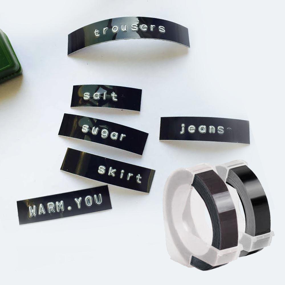 Na czarnej taśmie wytłoczysz wybrane przez siebie litery lub cyfry. Taśmę wystarczy wsunąć do etykieciarki. Gotowy napis etykieciarka sama przycina i jest on od razu gotowy do przyklejenia. Trójwymiarowe napisy na czarnych etykietach wyglądają nowocześnie i są praktycznym rozwiązaniem.