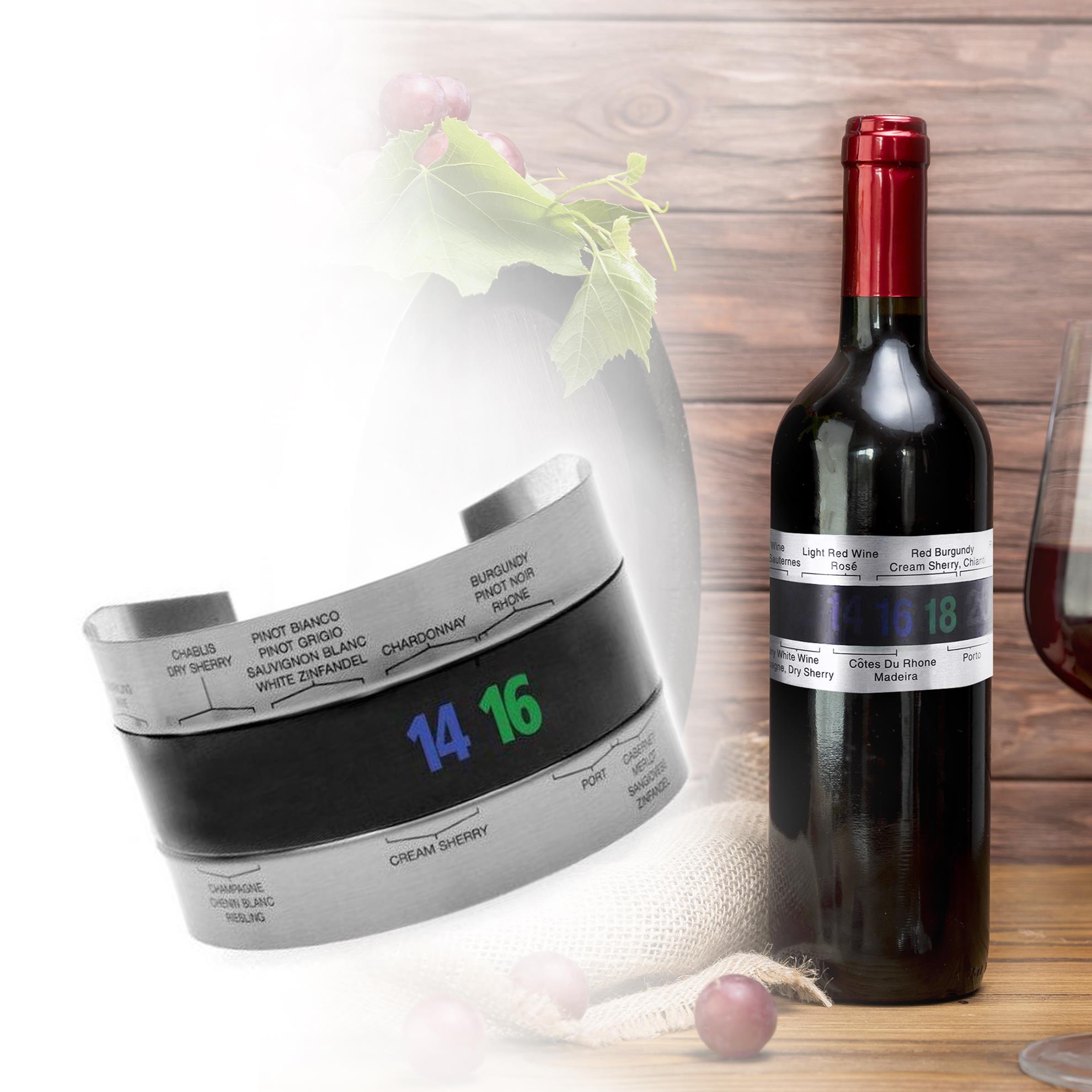 Termometr jest rozciągliwy, dzięki czemu można go nałożyć na każdą butelkę wina. Nałóż termometr na butelkę, umieszczając go poza etykietą, poczekaj około 40 sekund. Temperatura się ustabilizuje i zacznie pokazywać stopnie w Celsjusza. Na termometrze są napisy w języku angielskim, jeden zestaw napisów znajduje się na górnej części, a kolejny na dolnej, pośrodku jest pasek pokazujący temperaturę. Jeśli temperatura będzie zbyt wysoka lub niska, umieść wino albo w lodówce, albo w cieple. Zakres mierzenia temperatury wynosi od +2 do +24 °C.