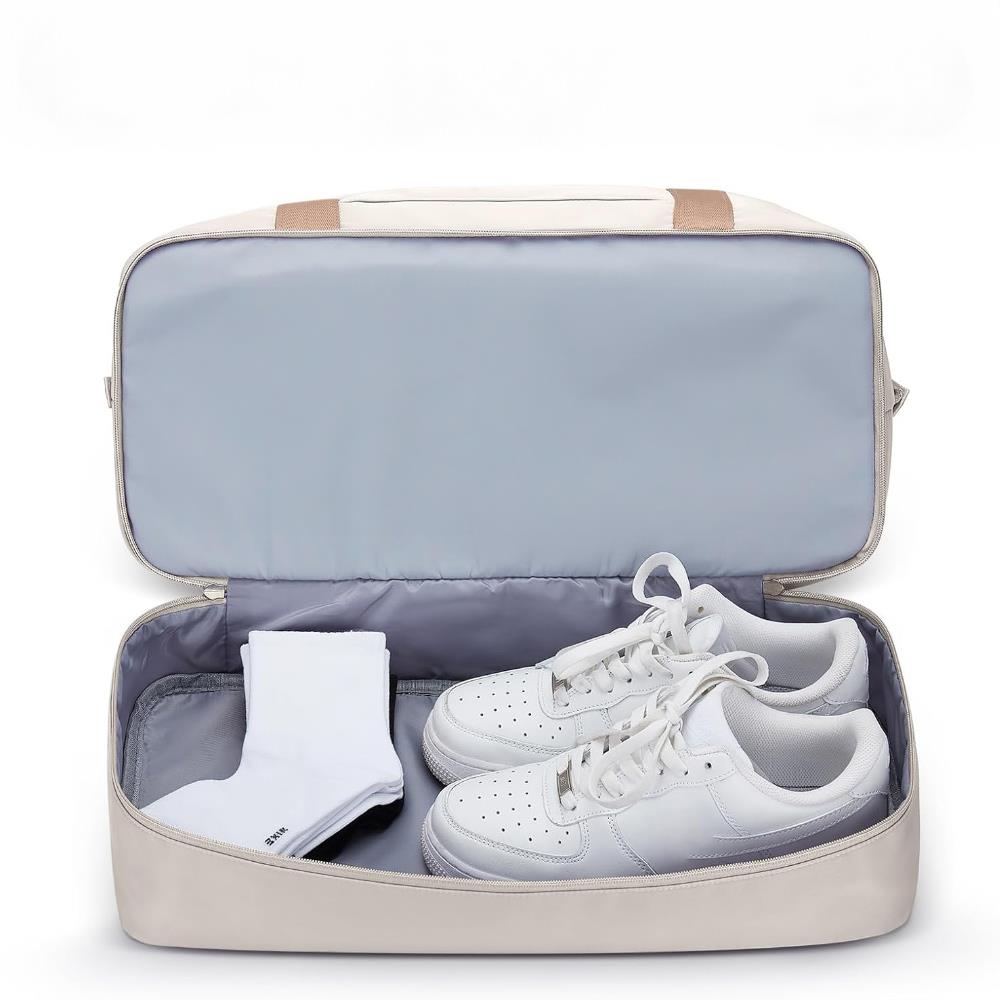 Nie musisz być obieżyświatem, żeby wiedzieć, że odpowiedni bagaż to podstawa spokojnej i bezproblemowej podróży. Jeśli wybierasz się na weekend lub w delegację, duża walizka czy torba to zbędny balast, a plecak lub torebka na rzeczy zwykle nie wystarczą. Dlatego mamy dla Ciebie tę piękną torbę podróżną, którą wykorzystasz zarówno w samolocie, jak i podczas popołudnia na siłowni. W dolnej części znajdziesz oddzielną przegrodę na obuwie, a wewnątrz kilka kieszeni, dzięki którym uporządkujesz produkty do higieny osobistej, wartościowe przedmioty czy ubrania – i wszystko będzie świetnie zorganizowane. Torba sprawdzi się także jako bagaż podręczny, a łatwo przymocujesz ją także do walizki na kółkach. Możesz ją nosić w ręce jak torebkę albo przewiesić przez ramię dzięki odpinanemu, wyściełanemu paskowi. Krótko mówiąc, stanie się Twoim niezbędnym towarzyszem, gdziekolwiek się wybierzesz, a dzięki wodoodpornemu wykończeniu i przemyślanemu designowi będziesz mógł na nią liczyć w każdej sytuacji. Bez względu na to, czy wybierzesz się za ocean, czy tylko kilka metrów na siłownię – z tą torbą każda podróż będzie komfortowa i przyjemna.