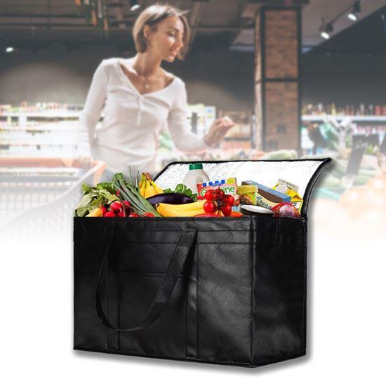 Już zawsze przyniesiesz ze sklepu tylko świeżą żywność. Torba termiczna na zakupy posiada wewnątrz folię aluminiową, która pomaga utrzymać aktualną temperaturę żywności. Dzięki temu żywność pozostaje świeża również w drodze do domu. Torba wykonana jest z mocnego poliestru w czarnym kolorze. Po każdej stronie znajduje się jeden uchwyt ułatwiający przenoszenie, a torbę można wygodnie zapiąć na dwustronny zamek błyskawiczny.