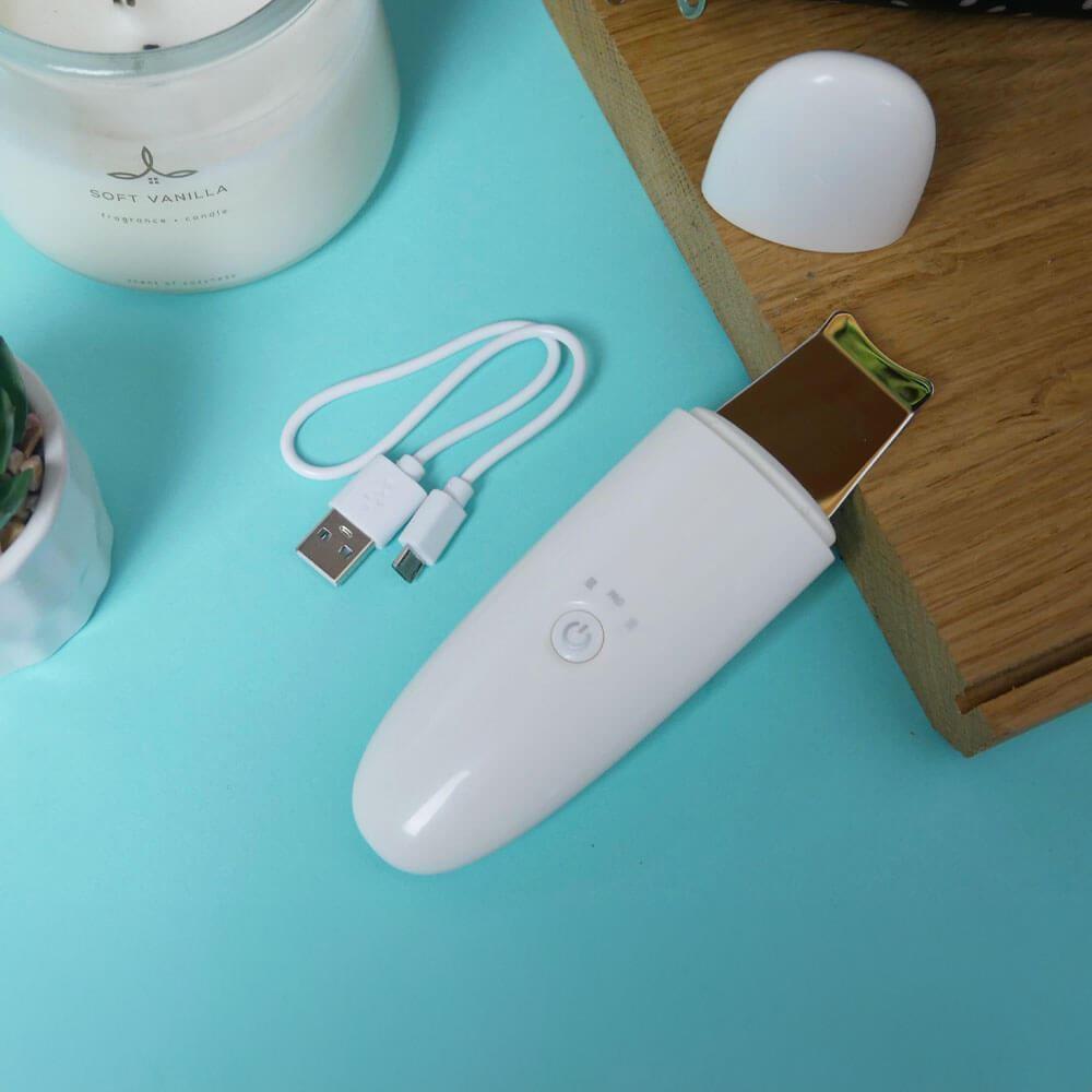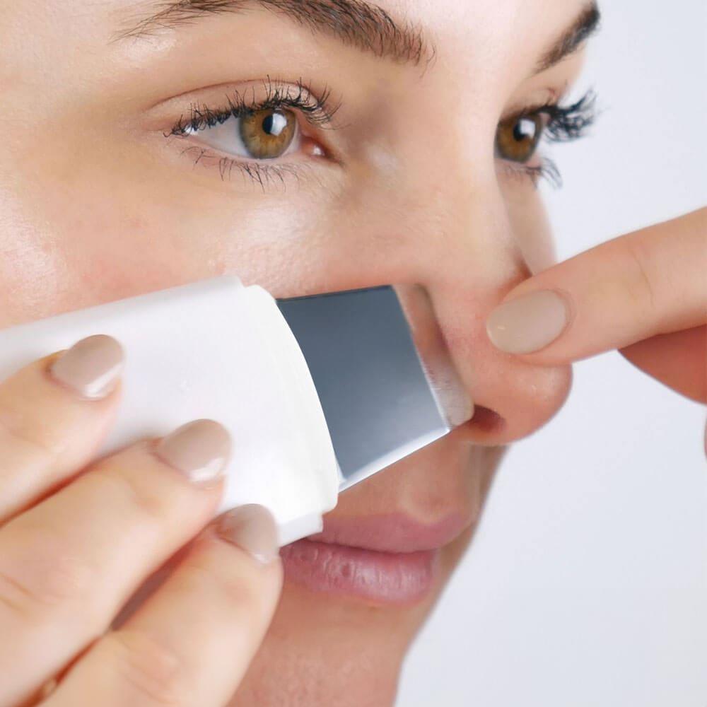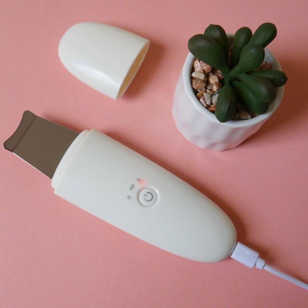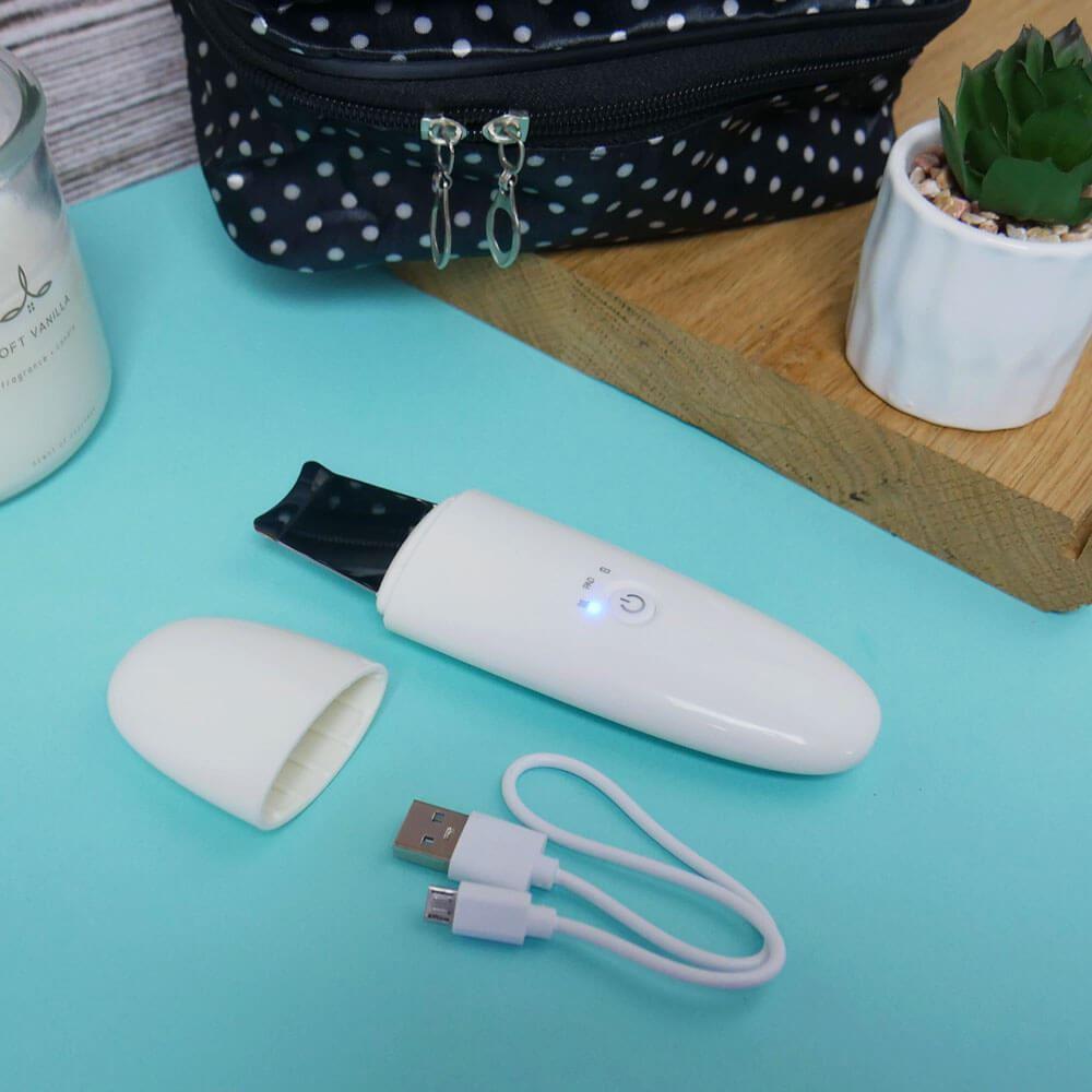 Szpatułka ultradźwiękowa nadaje się do każdego typu cery. Jej użycie jest bardzo proste. Po demakijażu wystarczy zwilżyć twarz i przyłożyć szpatułkę pod kątem 45 stopni. Następnie delikatnymi ruchami oczyścić całą twarz. Za pomocą przycisku możesz przełączać się między 2 trybami pracy. Po rozładowaniu urządzenie ładuje się łatwo za pomocą kabla USB.