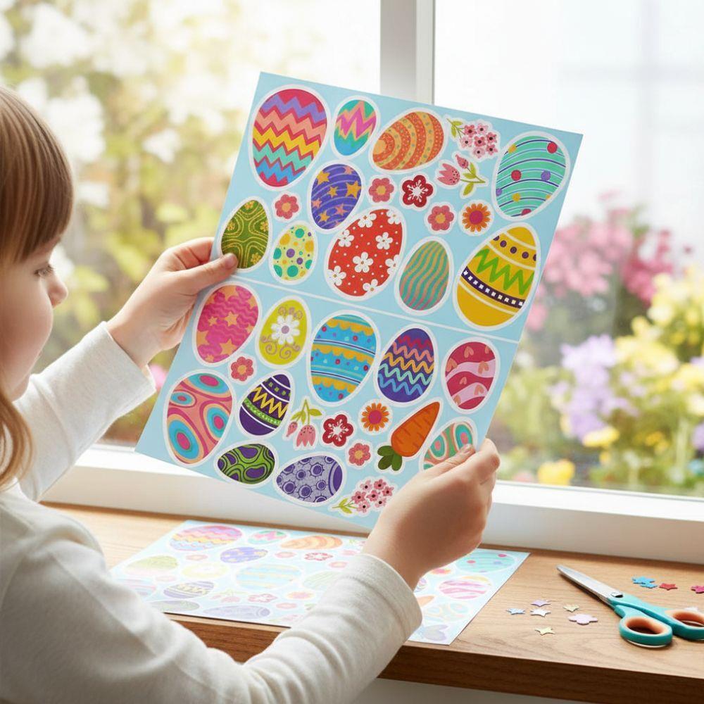Opakowanie zawiera 2 arkusze z 35 naklejkami o różnych rozmiarach i wzorach – pisanki, kwiaty oraz drobne wiosenne motywy. Naklejki są statyczne, nie zawierają kleju, dzięki czemu nie pozostawiają śladów i można je łatwo zdjąć oraz ponownie wykorzystać.