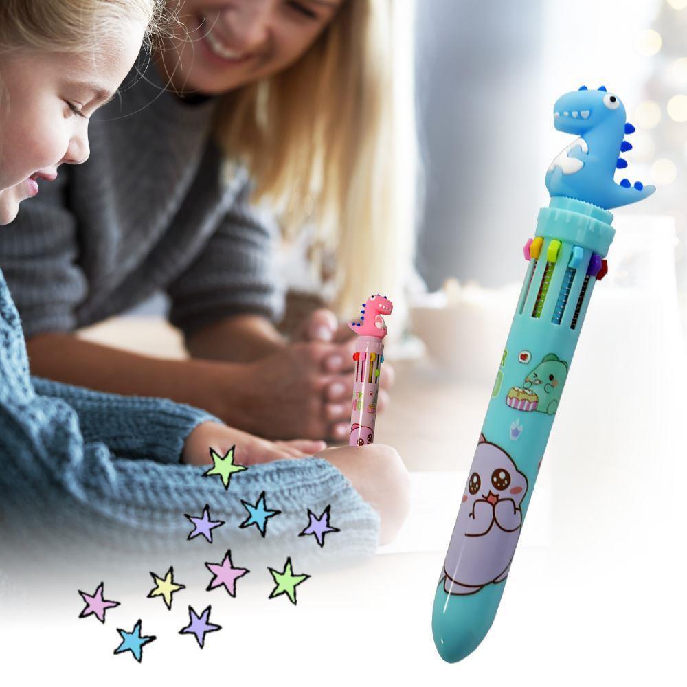 Ulubiony motyw dinozaura jest nie do przeoczenia. Teraz Twoje dzieci mogą pochwalić się nim także w szkole przed swoimi kolegami. Wielokolorowy długopis zrobi wrażenie na otoczeniu, ponieważ ma aż 10 wesołych kolorów. Między kolorami można dowolnie przełączać, naciskając głowę dinozaura. Wystarczy wybrać kolejny ulubiony kolor.