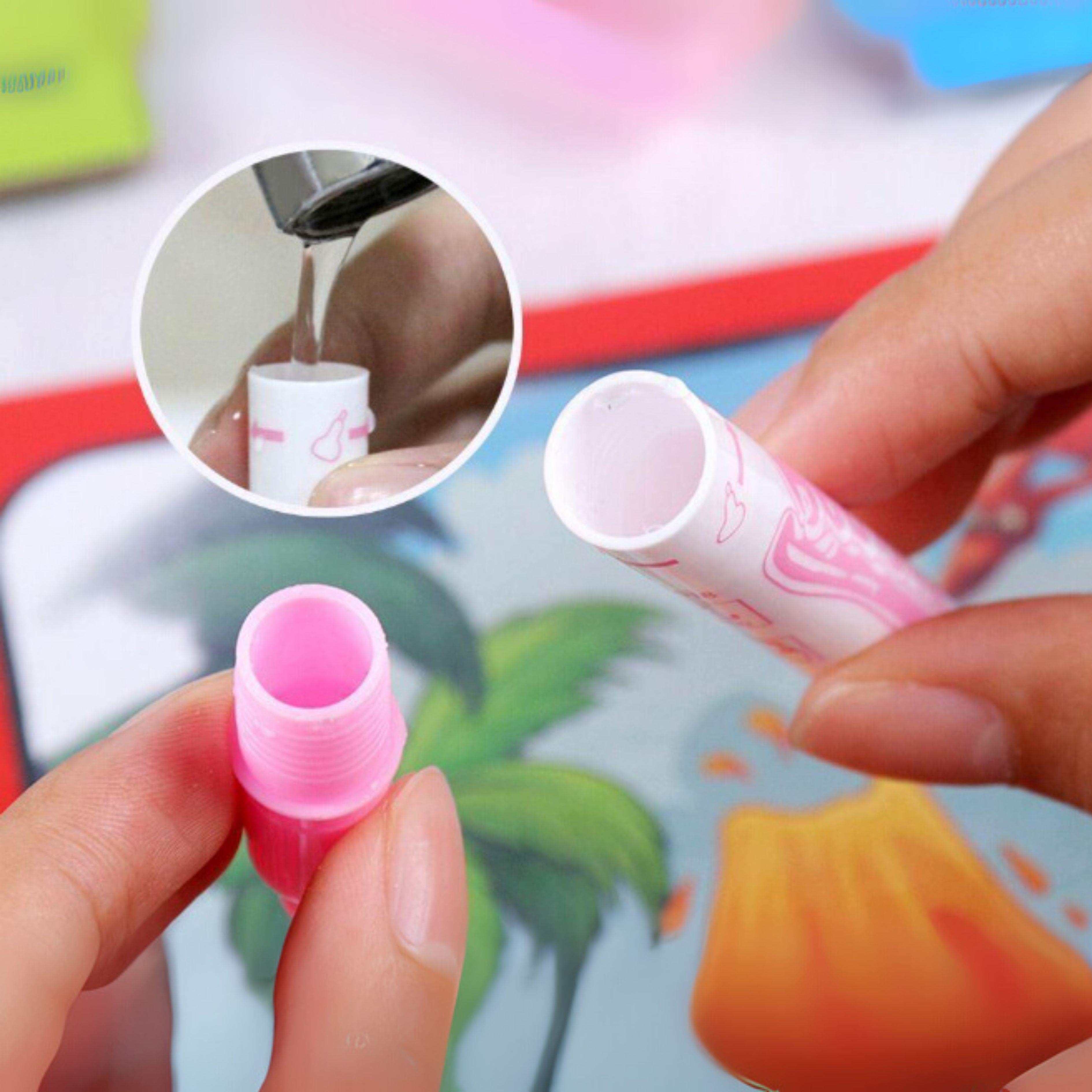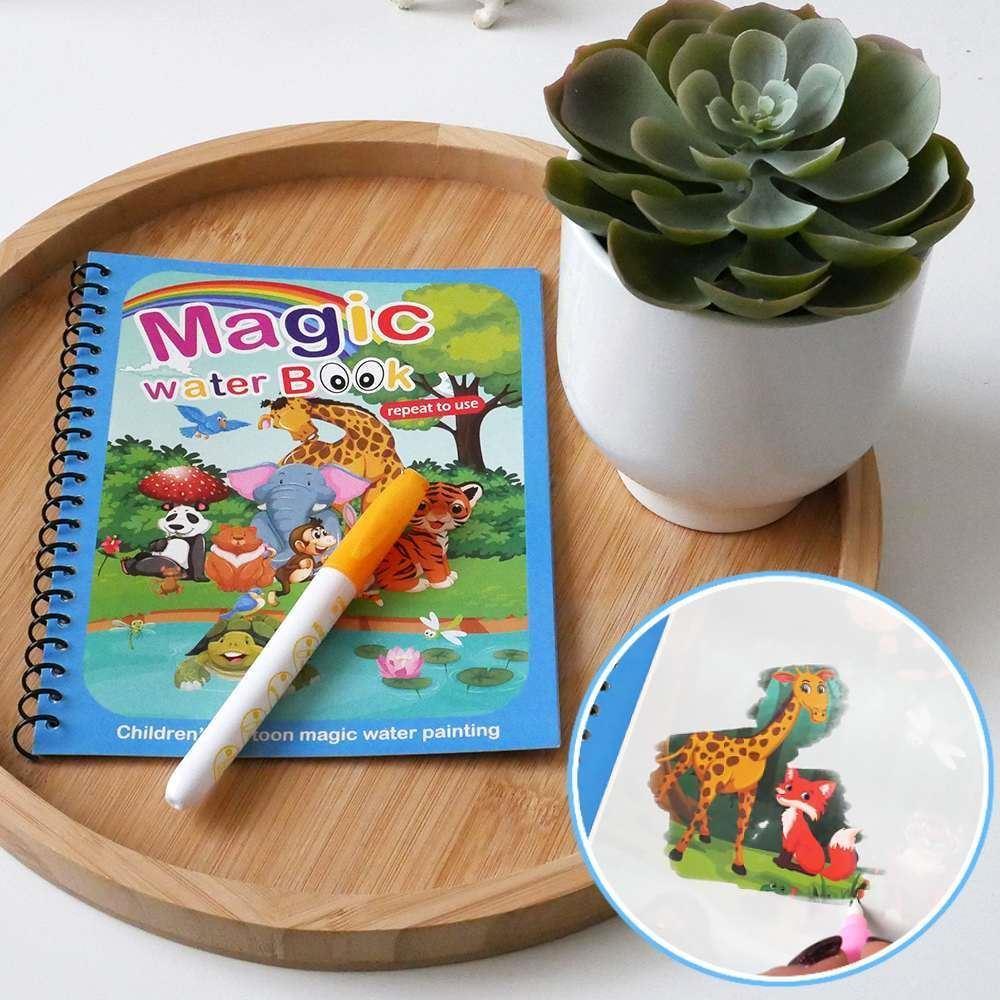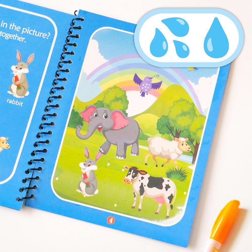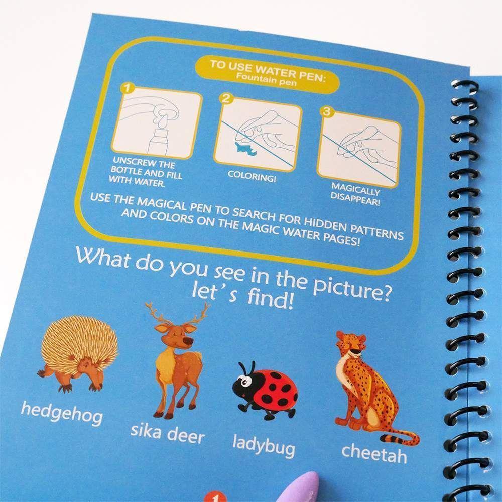 Oprócz zeszytu, częścią zestawu jest także magiczne pióro napełniane wodą. Wystarczy tylko usiąść i kilkoma pociągnięciami rozweselić obrazki. W ciągu kilku sekund z zwykłej białej kartki staje się piękne kolorowe widowisko. Malowanki są wielokrotnego użytku – kolory znikają po kilku minutach. Świetny pomysł na prezent.