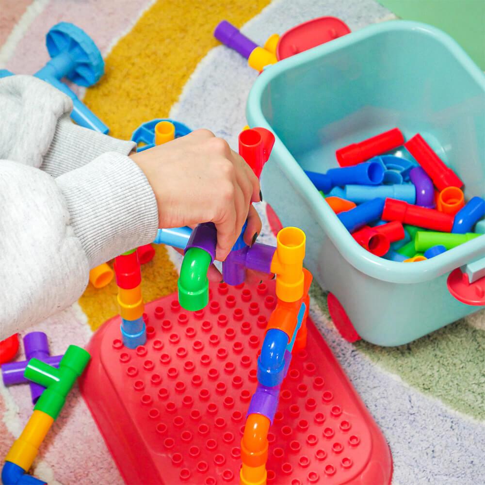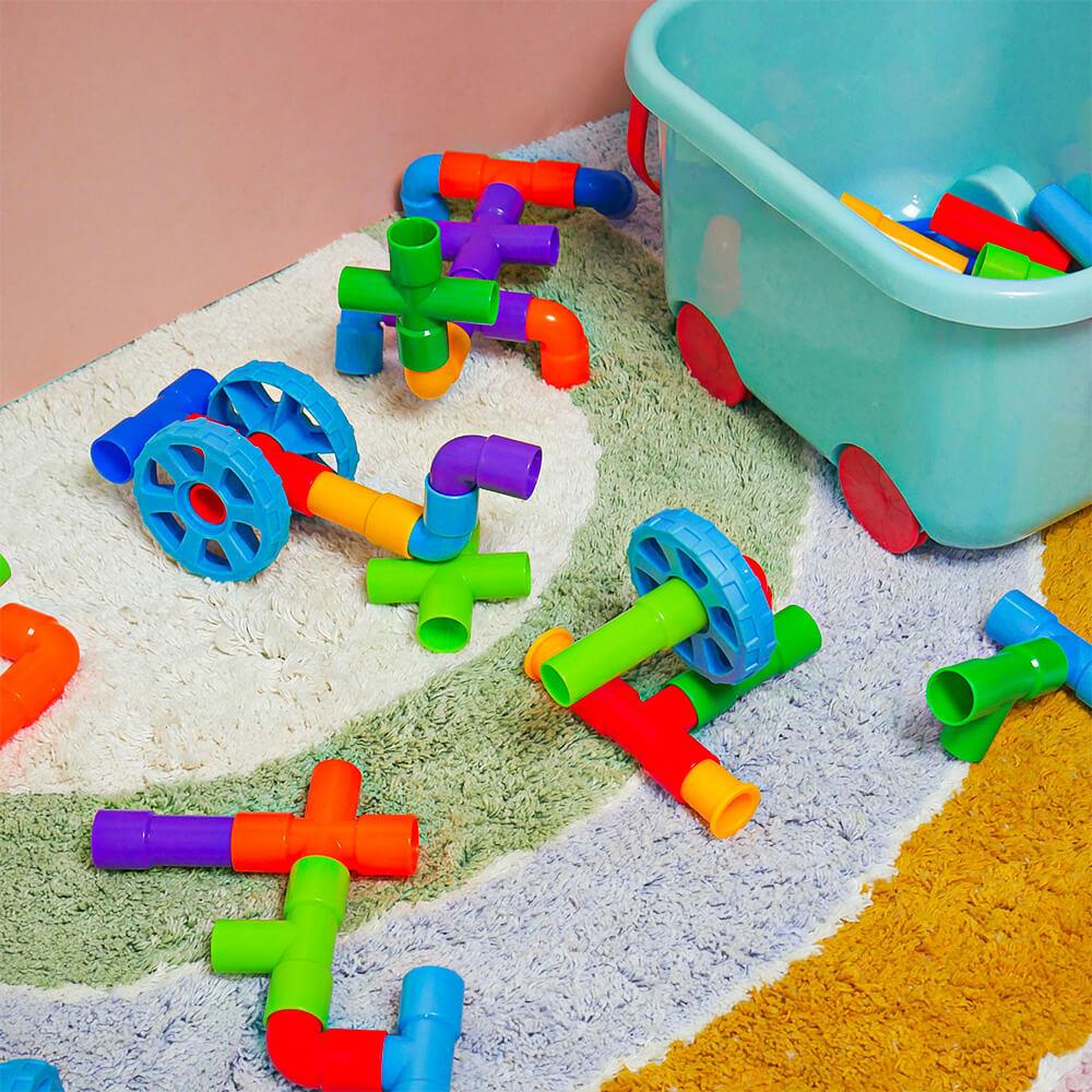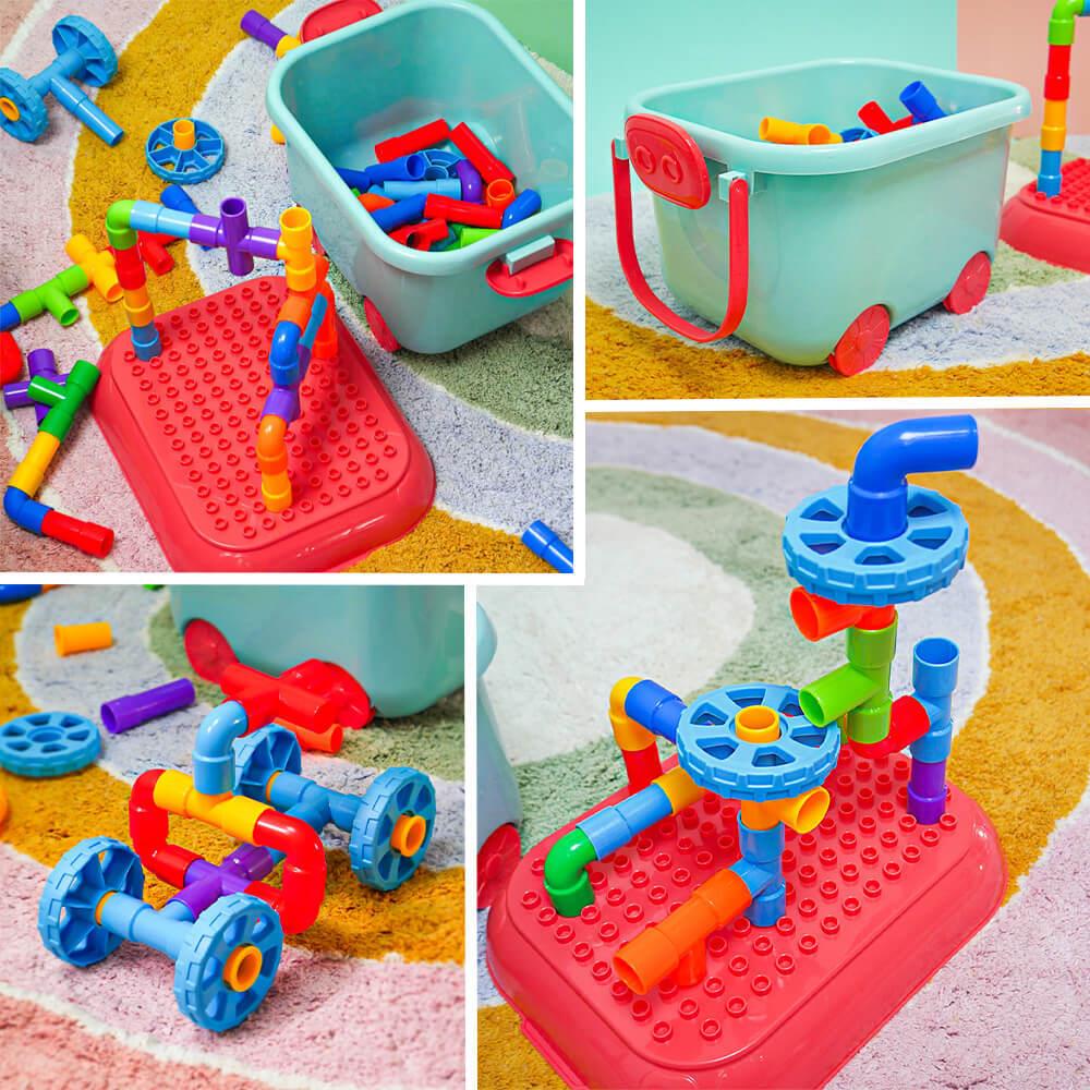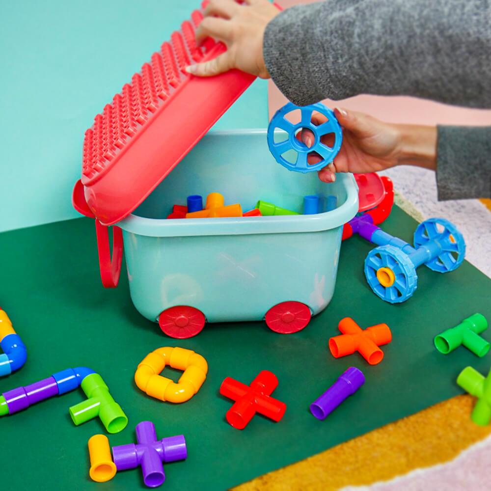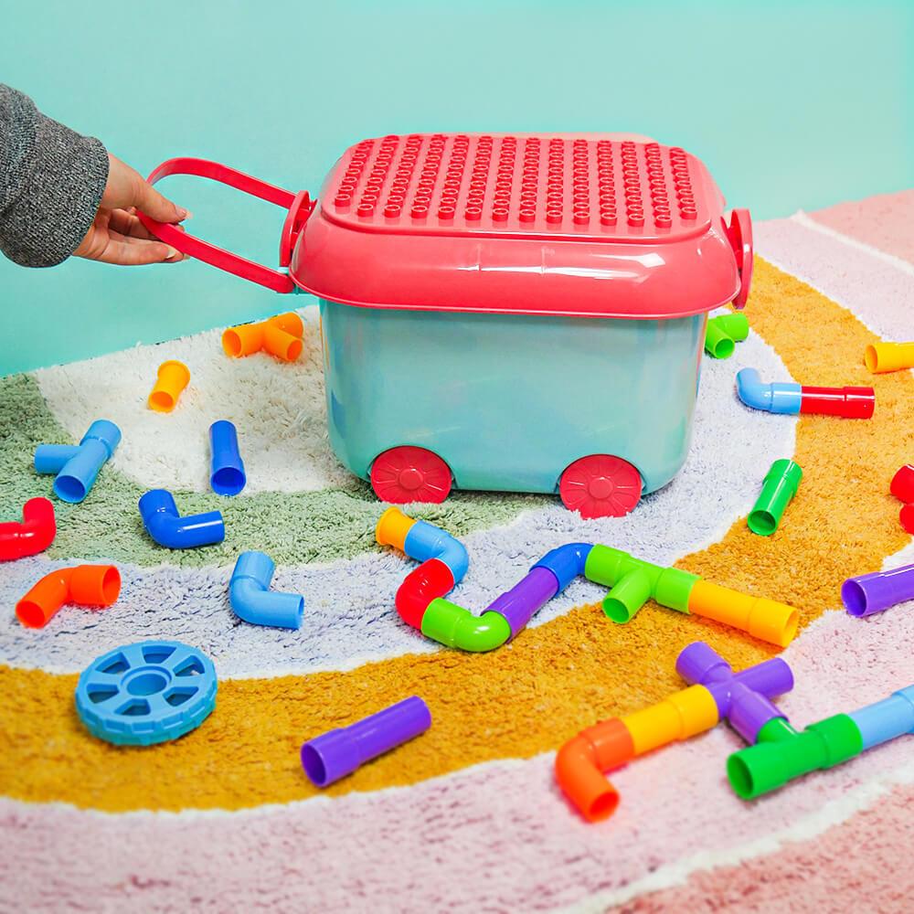 Zestaw wspiera kreatywność, wyobraźnię i rozwój małej motoryki w zabawny sposób. Dzieci mogą spróbować budować zgodnie z szablonem lub tworzyć według własnej wyobraźni. Możliwości są nieograniczone — od samochodzików po fantastyczne maszyny i roboty. Dzięki zabawie zespołowej dzieci uczą się współpracować, dzielić się i rozwijać ducha zespołowego. Po zabawie wszystko można łatwo schować z powrotem do wózka, a porządek jest zachowany w mgnieniu oka.