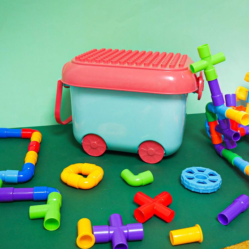 Zestaw konstrukcyjny w wózku jest doskonałym towarzyszem w domu i w podróży. Duże i bezpieczne elementy łatwo się składają i rozkładają, dzięki czemu zabawka ta nadaje się nawet dla małych dzieci. Wózek na kółkach działa jak walizeczka, do której dzieci szybko chowają wszystkie elementy i przewożą je, co zapobiega rozrzucaniu zabawek po podłodze.