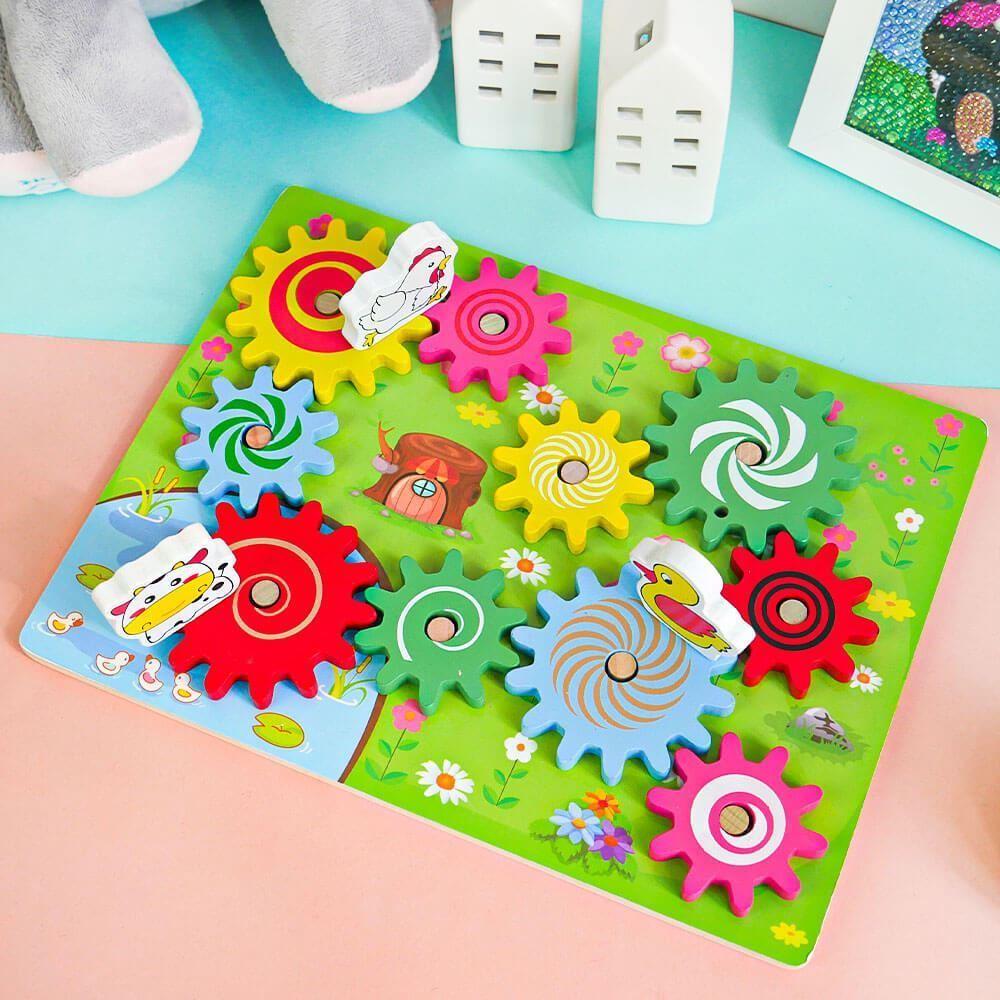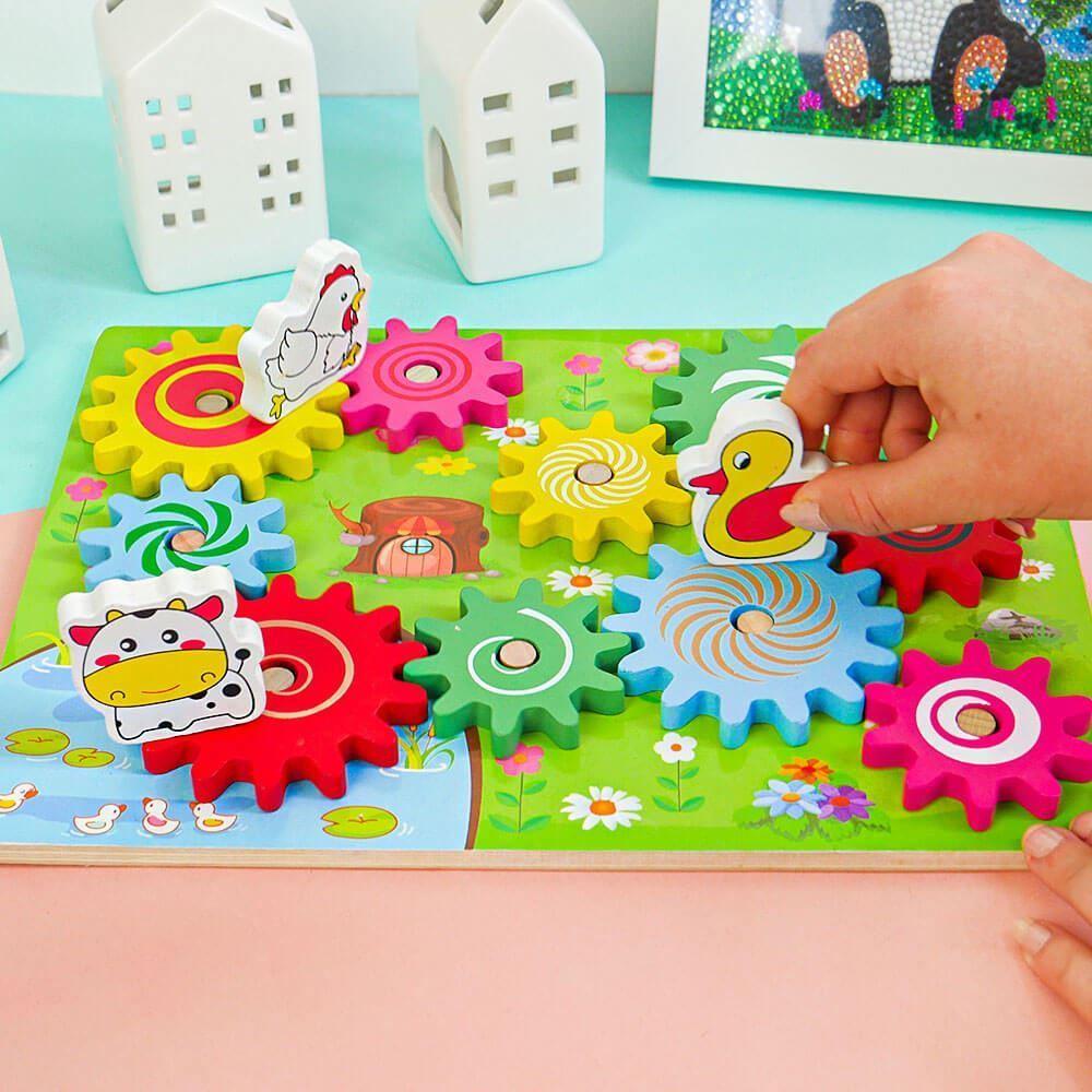 Drewniana zabawka z zębatkami ze zwierzątkami